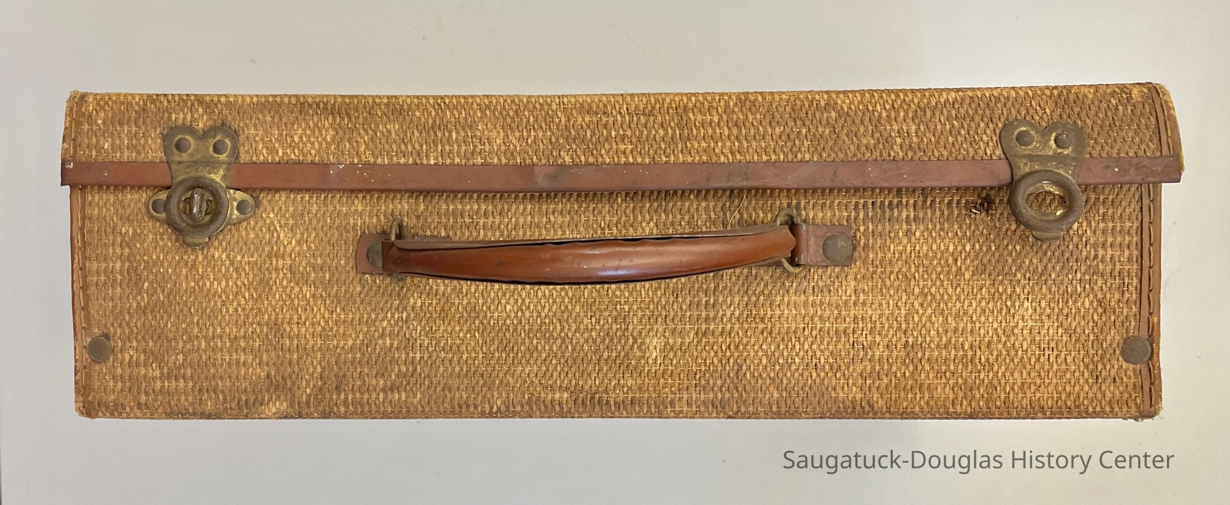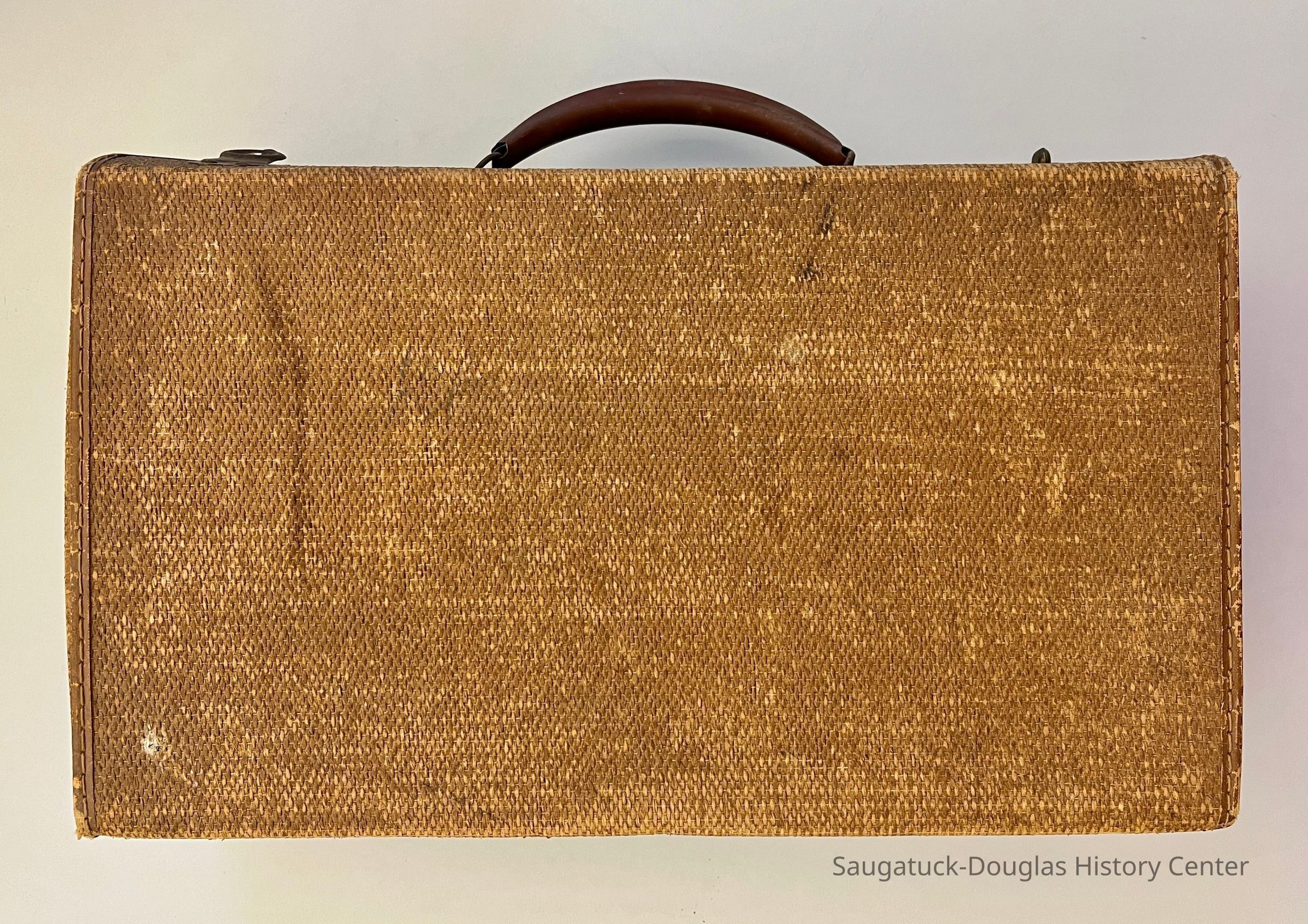 Bag B - Beige woven material valise. Two twist-lock metal closures (one is missing) and metal caring handle. The inside of the bag has brown-and-beige striped paper lining. Handwritten inside the lid is the text "Kleinheksel H.H. Holland RR5 Phone East Saugatuck 178"