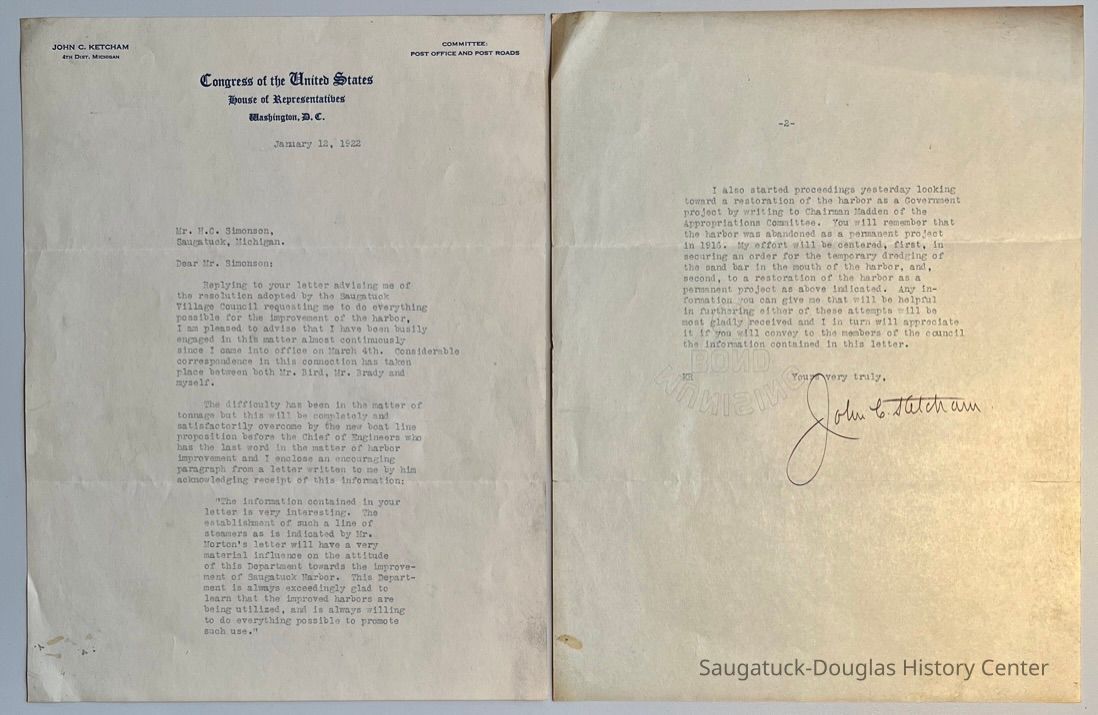 January 12, 1922 letter from John C. Ketcham, U.S. House of Representatives, 4th District, Michigan to H.C. Simonson, Village Clerk, about improving the harbor including dredging sand bars at the mouth of the Kalamazoo River to ease the passage of steamships.Context