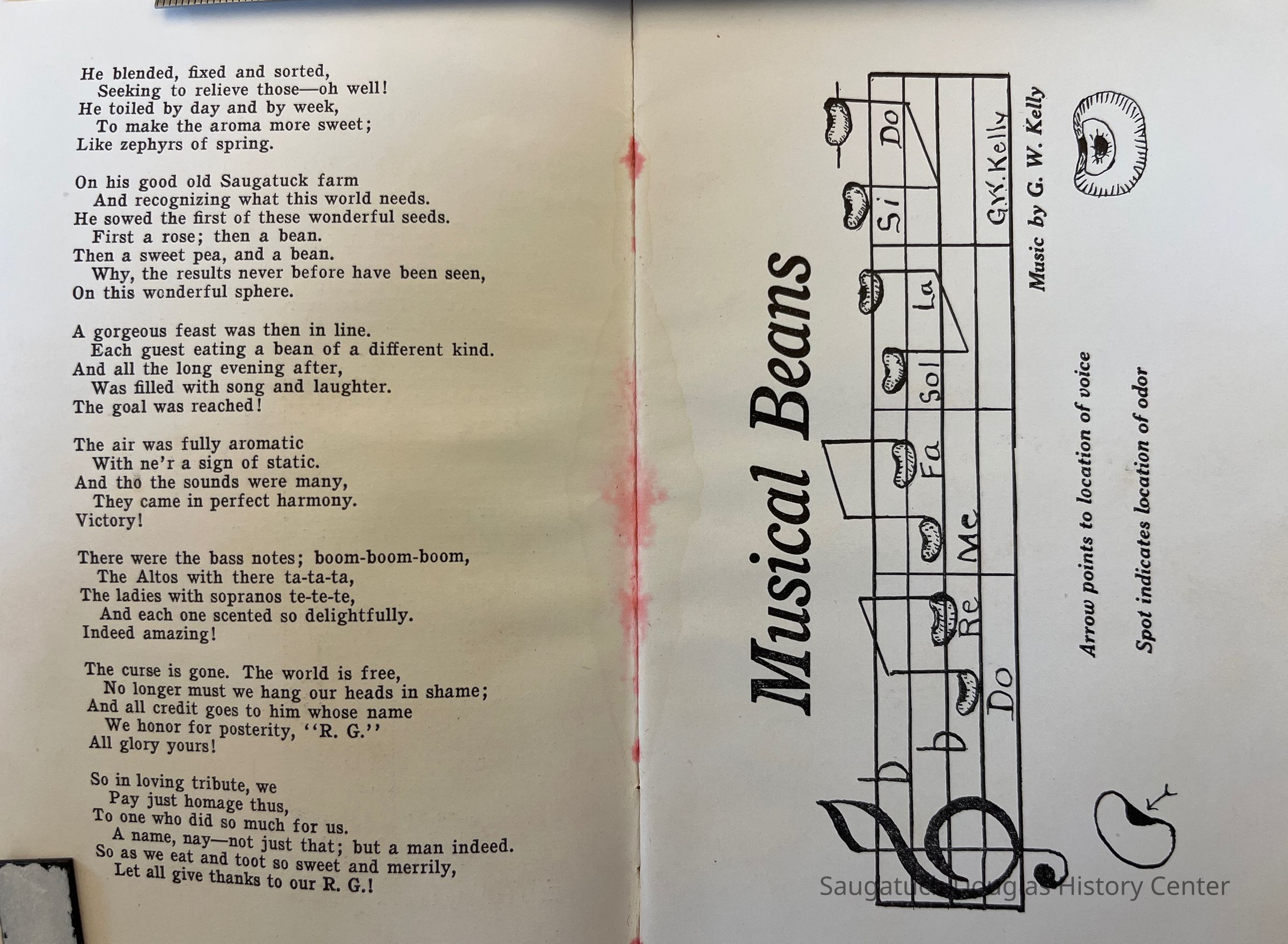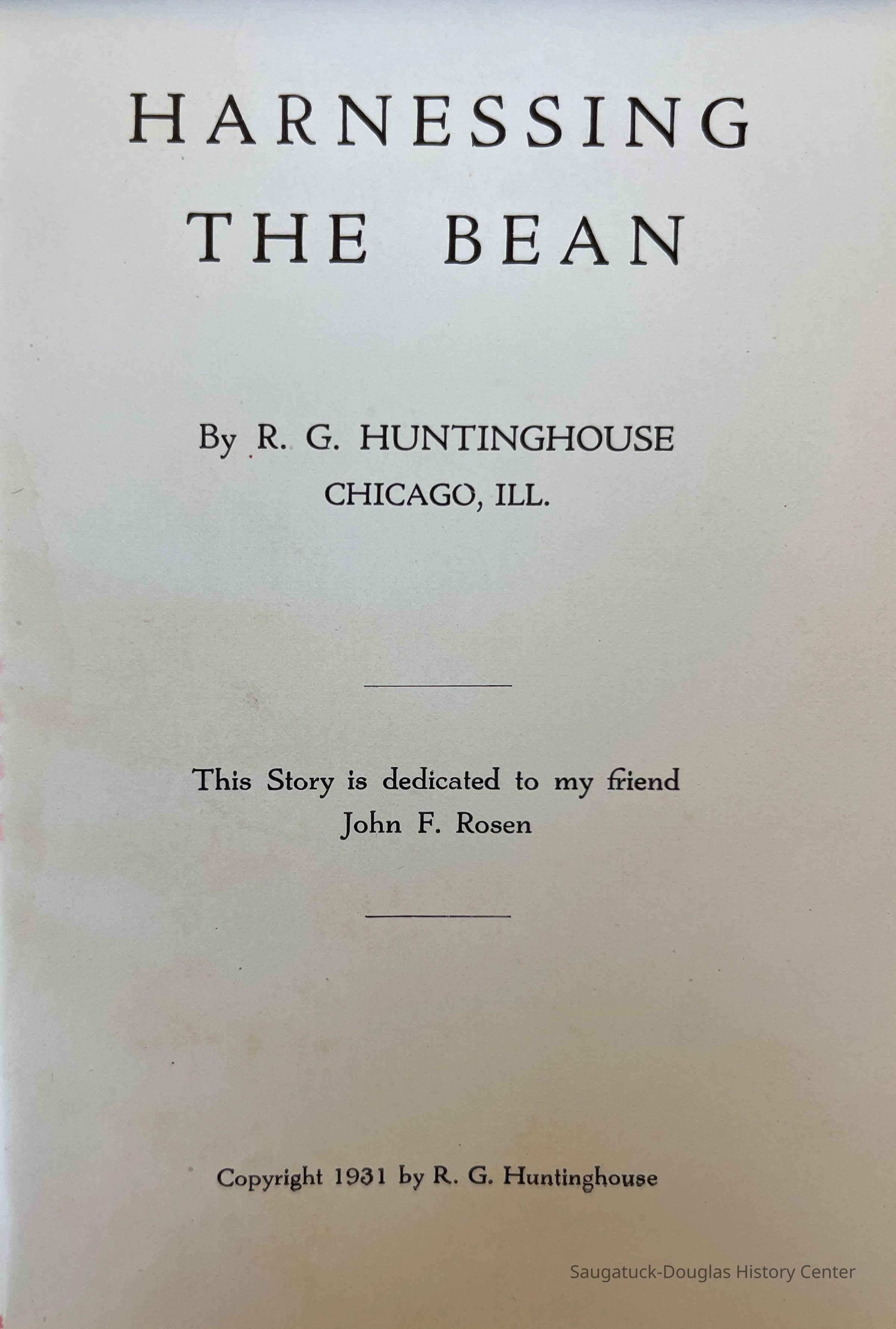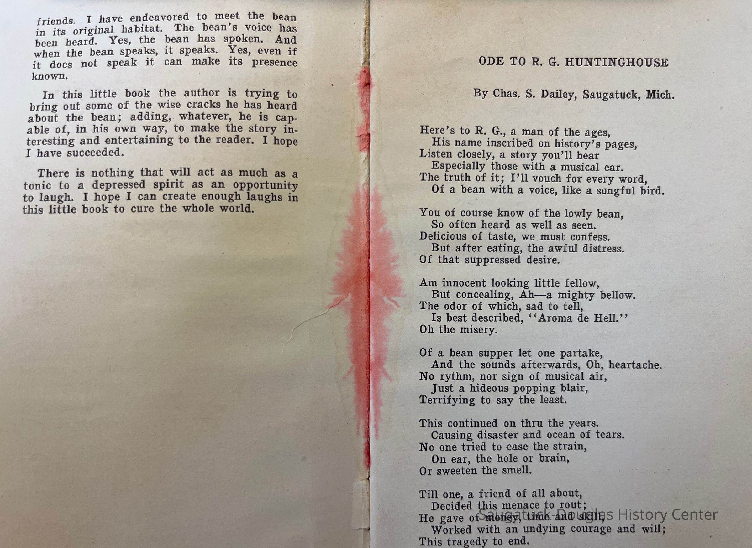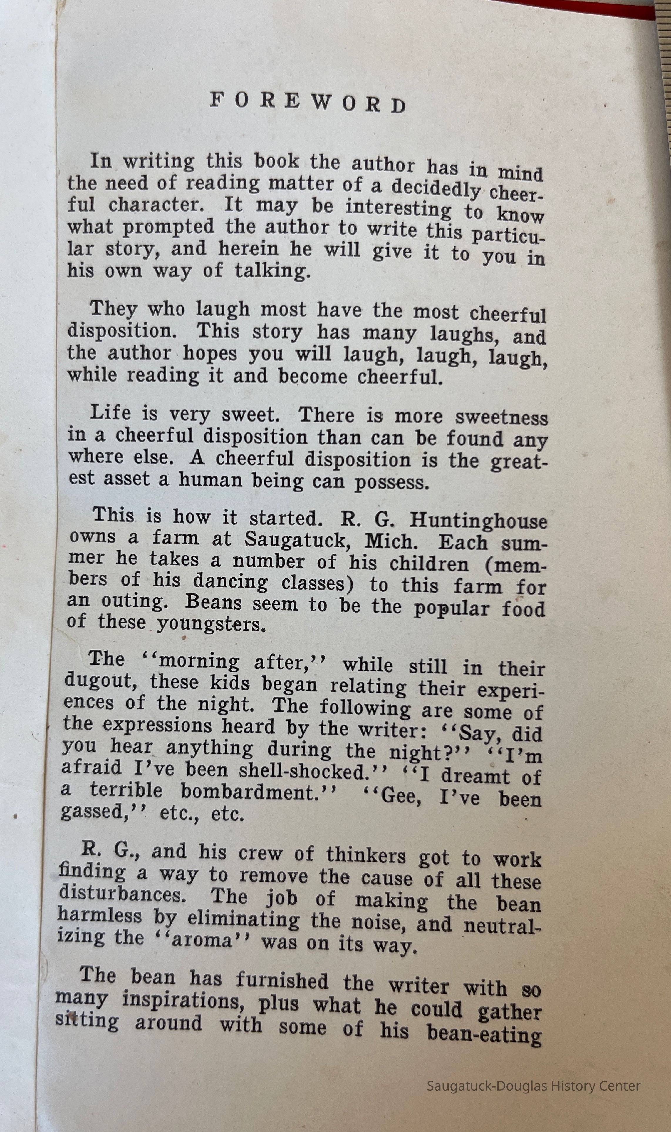 A tongue in cheek humerous story writtten by R.G. Huntinghouse. He was a bean farmer and dance instructor from Saugatuck who often had friends over to eat at his bean farm.Context