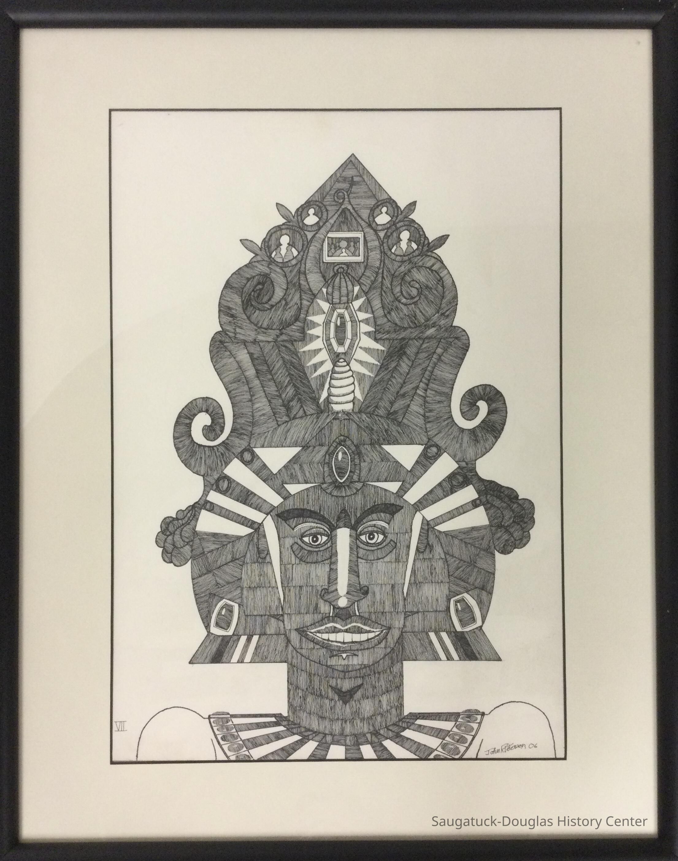 Pen and ink drawing of an abstract head with an Aztec-inspired headpiece.Type of Drawing