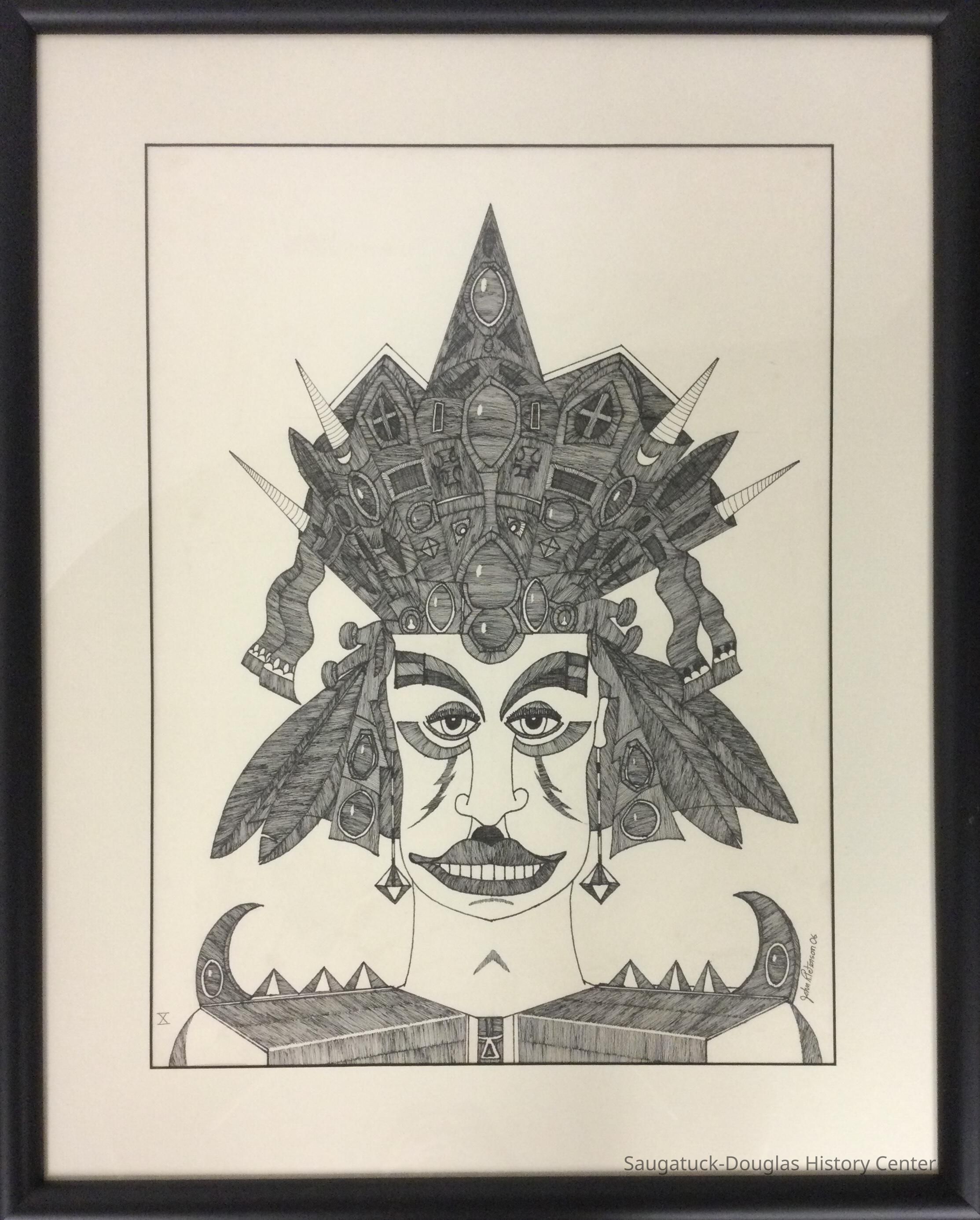 Pen and ink drawing of a jester style male face and hat dated 2006. Framed in a matted wooden black frame.Type of Drawing