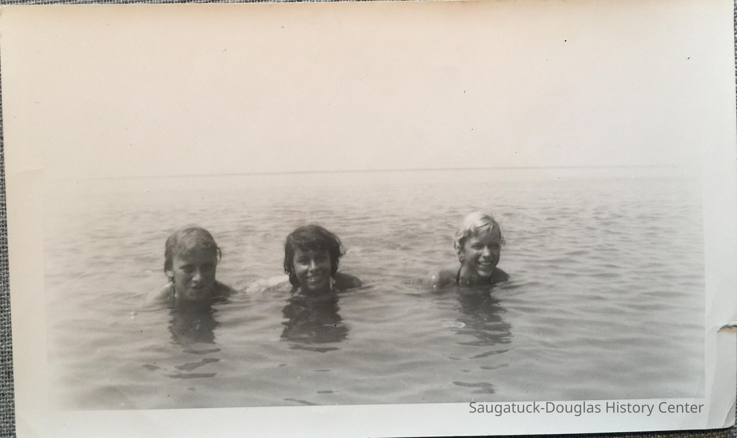 The heads of three young women emerge from the lake waters.