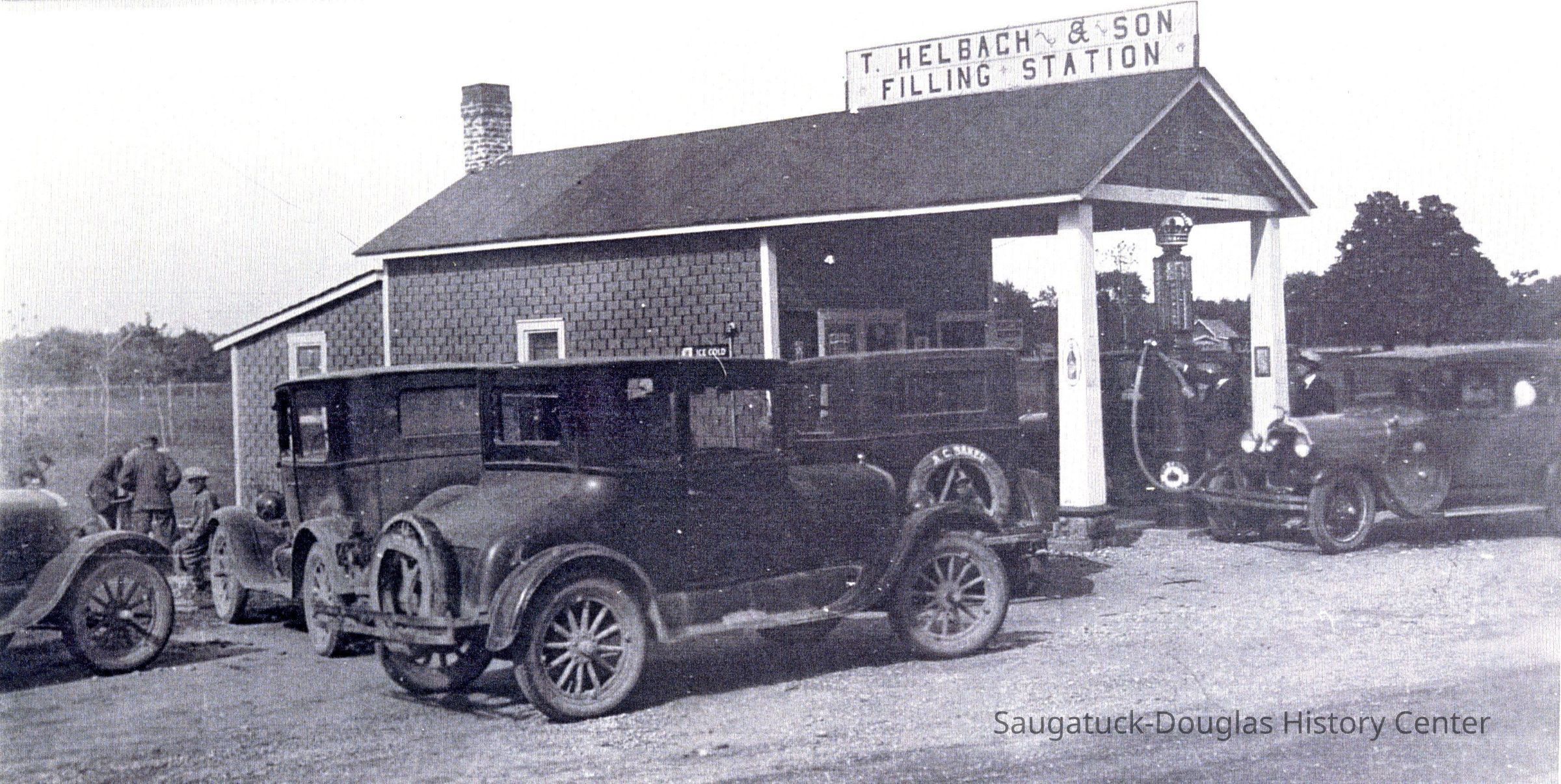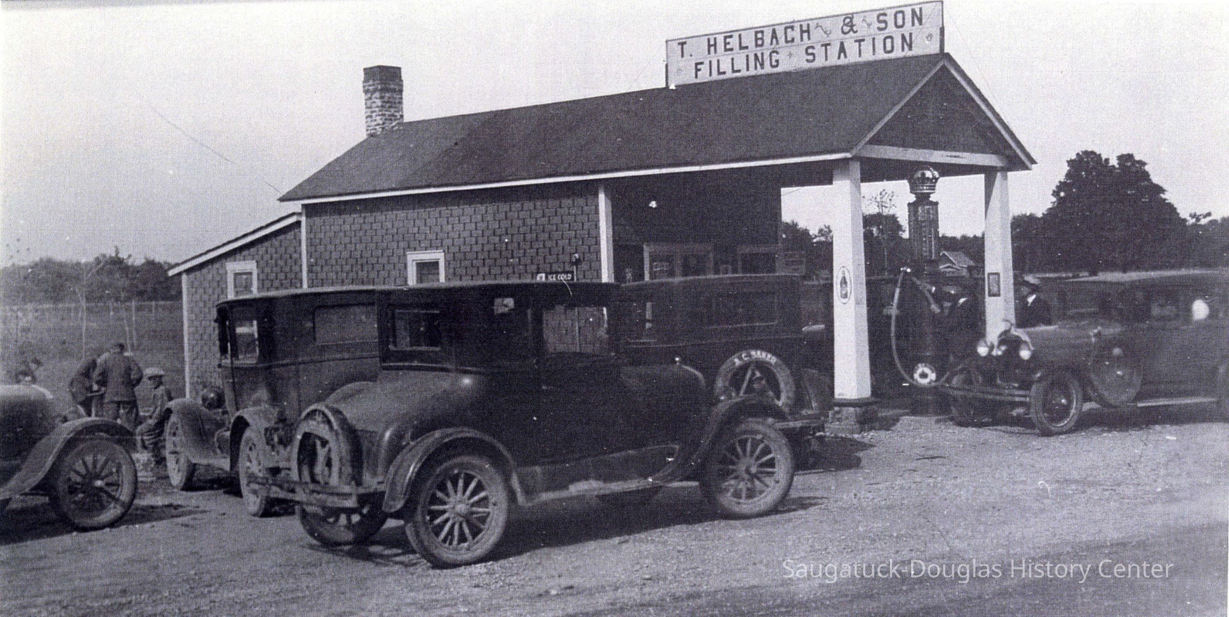 Small gas station with one, crown-capped pump and multiple cars parked around the building. Location unknown.Photograph Details