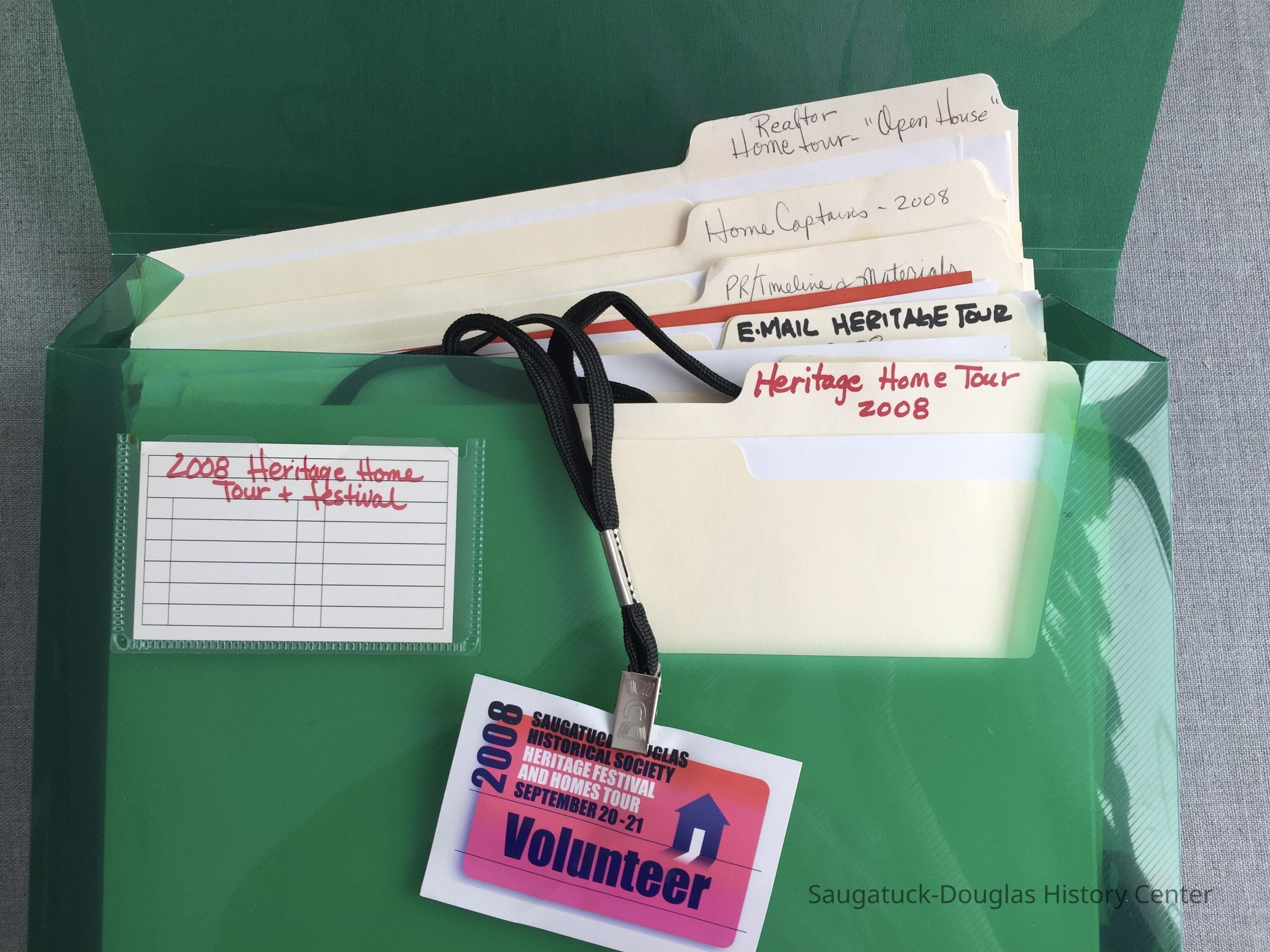 Green plastic filing case that contains 13 file folders of documents about the 7th annual, September 21, 2008 Home Tour, "Eight Moments in Time" a fundraiser for the Saugatuck Douglas Historical Society.
