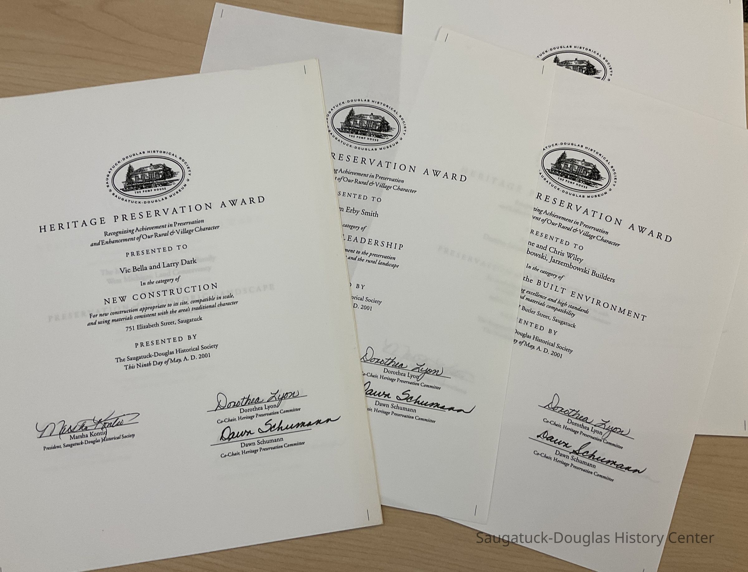 Photo copies of the Heritage Preservation awards presented to various people in 2001.