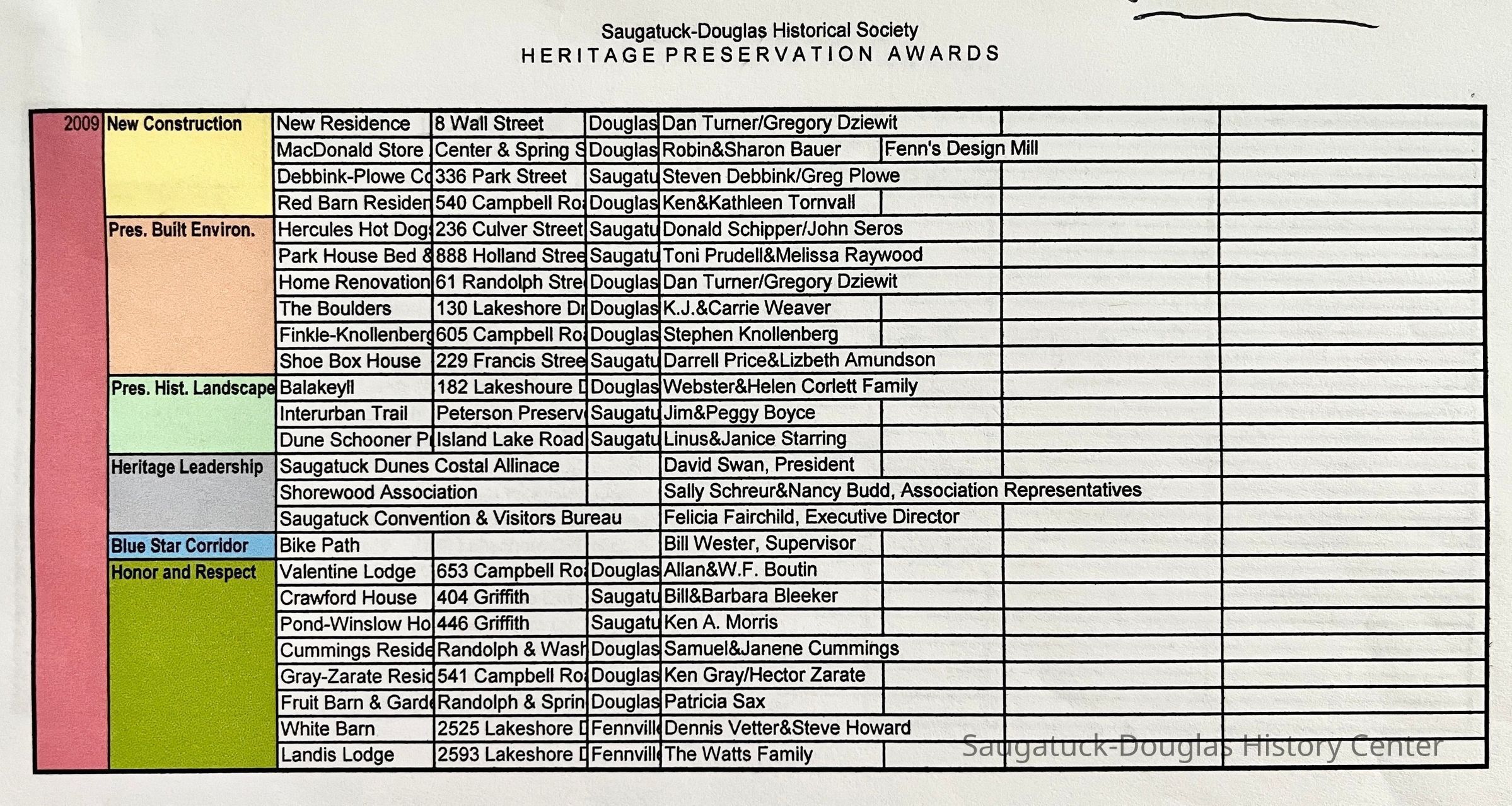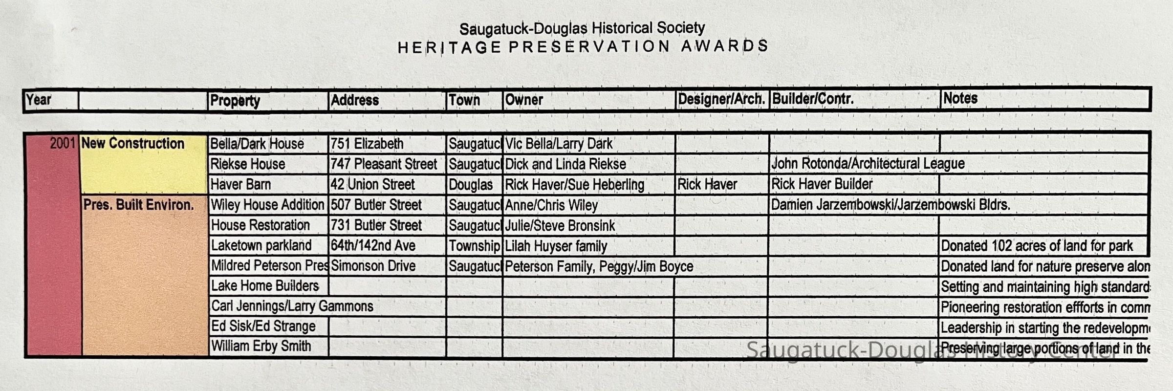 Eight spreadsheet print outs of award winners for the Heritage Preservations Awards from 2001 to 2009. The list includes year, category, property name, address, town and owner's names.