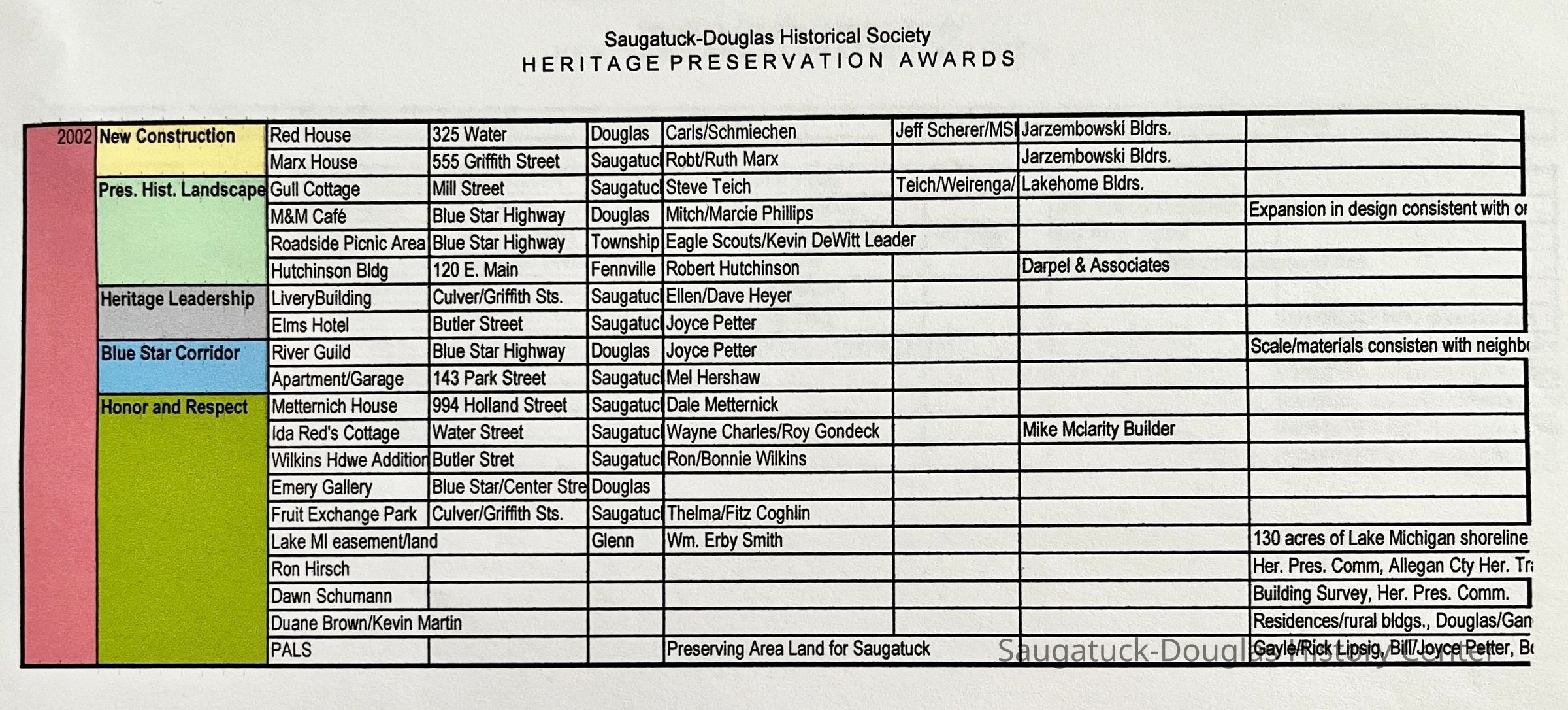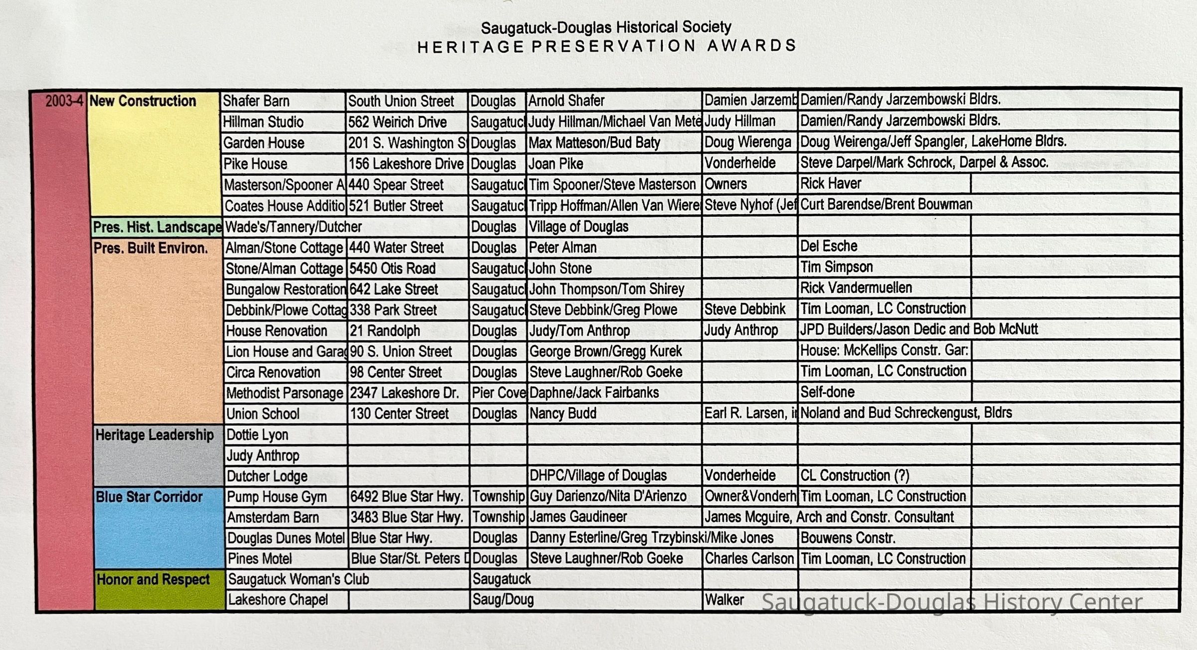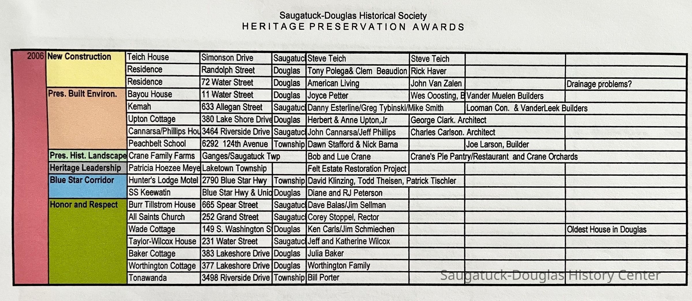 799 Simonson Bella/Dark, 747 Pleasant/Riekse, 42 S Union/Haver Barn, 507 Butler/Ira Koning/Wiley House 1922 w/1999 addition, 731 Butler, 325 Water Street/Red House, 555 Griffith/Rabbi Marx house, 440 Spear/Masterson-Spooner, 521 Butler/Timothy Coates House 1895-, 156 Lakeshore/Pike House, 2790 Blue Star Hwy/Jars/Amble Inn/Hunter's Lodge, Peachbelt School and Gallery, 380 Lake Shore/Upton Cottage, 231 Water/Phelps/Taylor/Wilcox house, 383 Lakeshore/Baker Cottage, 337 Lakeshore/Worthington cottage, 605 Campbell/Knollenberg, 649 Pleasant/Deux Goose Cottage, 336 Park/Treetops, 130 Lakeshore/The Boulders, 29 E Randolph/CummingsCreate Date