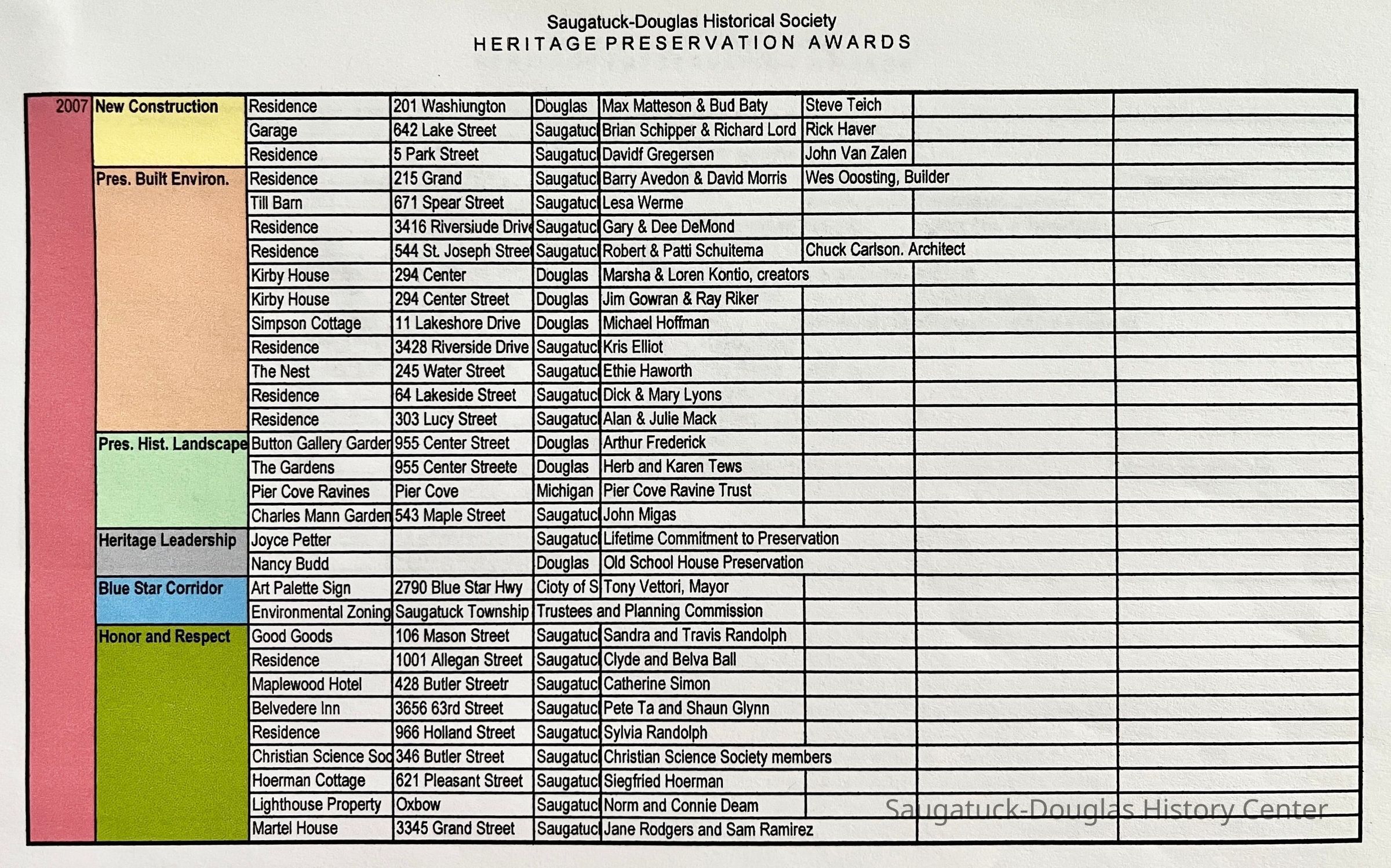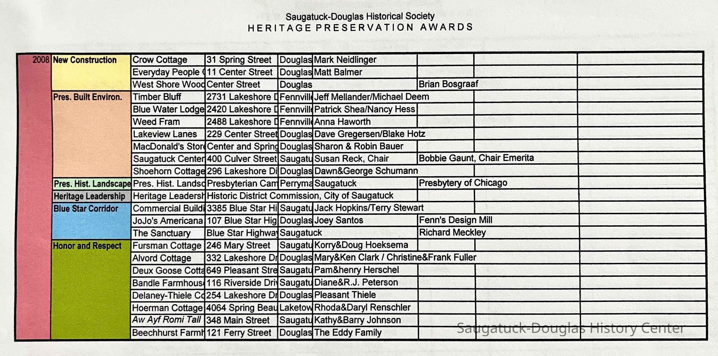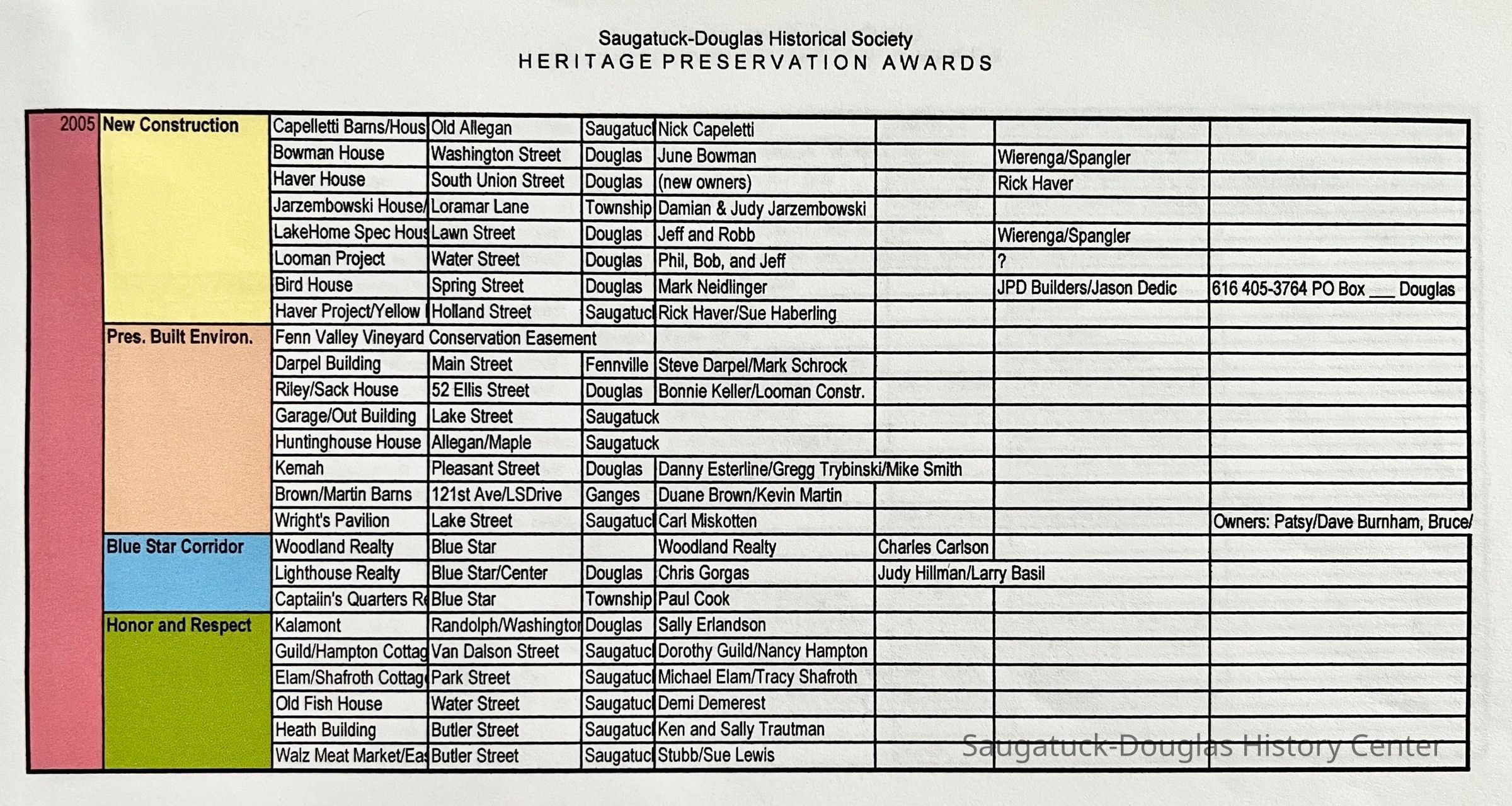 799 Simonson Bella/Dark, 747 Pleasant/Riekse, 42 S Union/Haver Barn, 507 Butler/Ira Koning/Wiley House 1922 w/1999 addition, 731 Butler, 325 Water Street/Red House, 555 Griffith/Rabbi Marx house, 440 Spear/Masterson-Spooner, 521 Butler/Timothy Coates House 1895-, 156 Lakeshore/Pike House, 2790 Blue Star Hwy/Jars/Amble Inn/Hunter's Lodge, Peachbelt School and Gallery, 380 Lake Shore/Upton Cottage, 231 Water/Phelps/Taylor/Wilcox house, 383 Lakeshore/Baker Cottage, 337 Lakeshore/Worthington cottage, 605 Campbell/Knollenberg, 649 Pleasant/Deux Goose Cottage, 336 Park/Treetops, 130 Lakeshore/The Boulders, 29 E Randolph/CummingsCreate Date