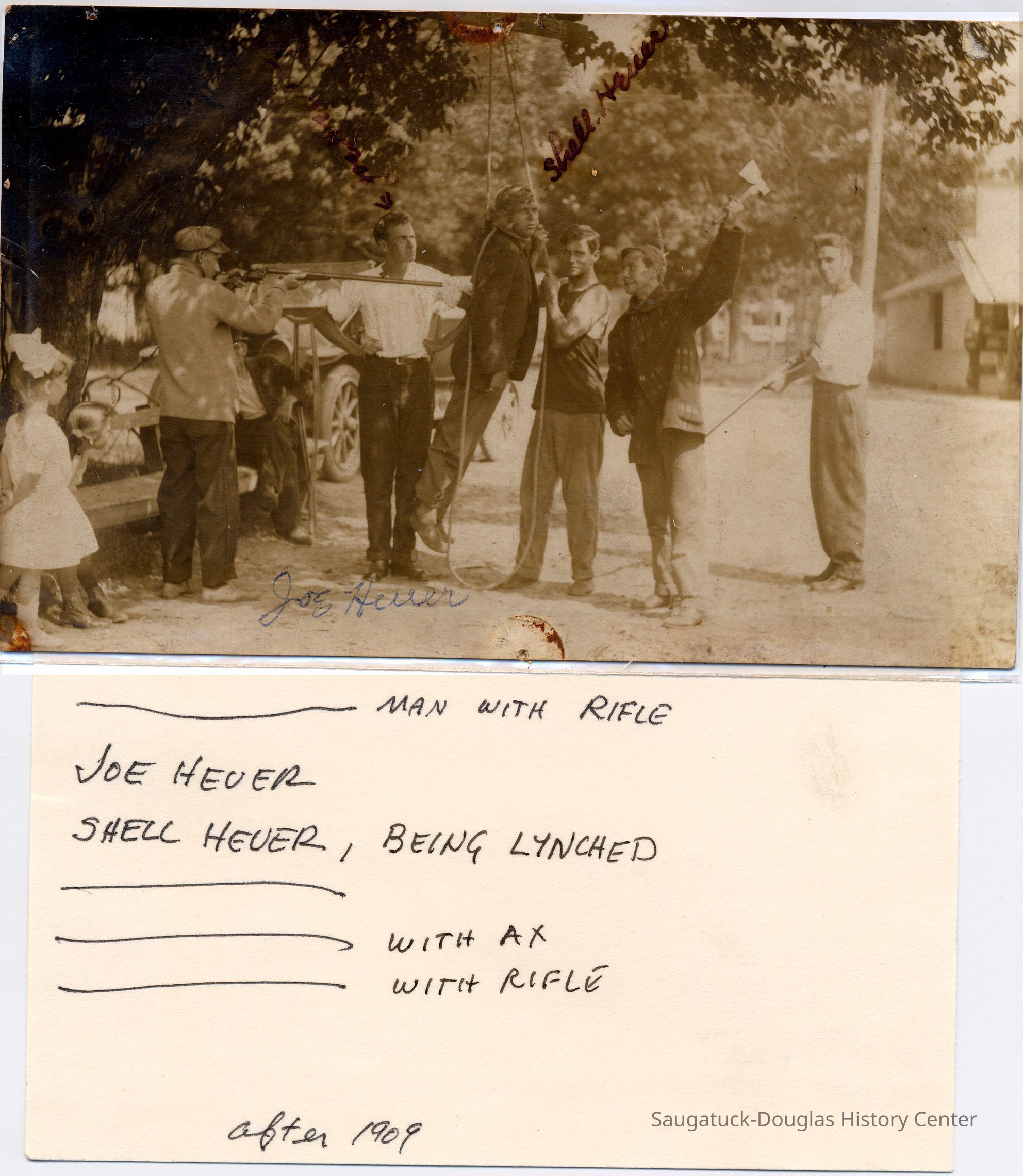A note indicates the men include Joe Heuer (with white shirt, hands on hips) and Shell Heuer, being lynched. Joe and Shelby were two of eight children from the John D. Heuer family.