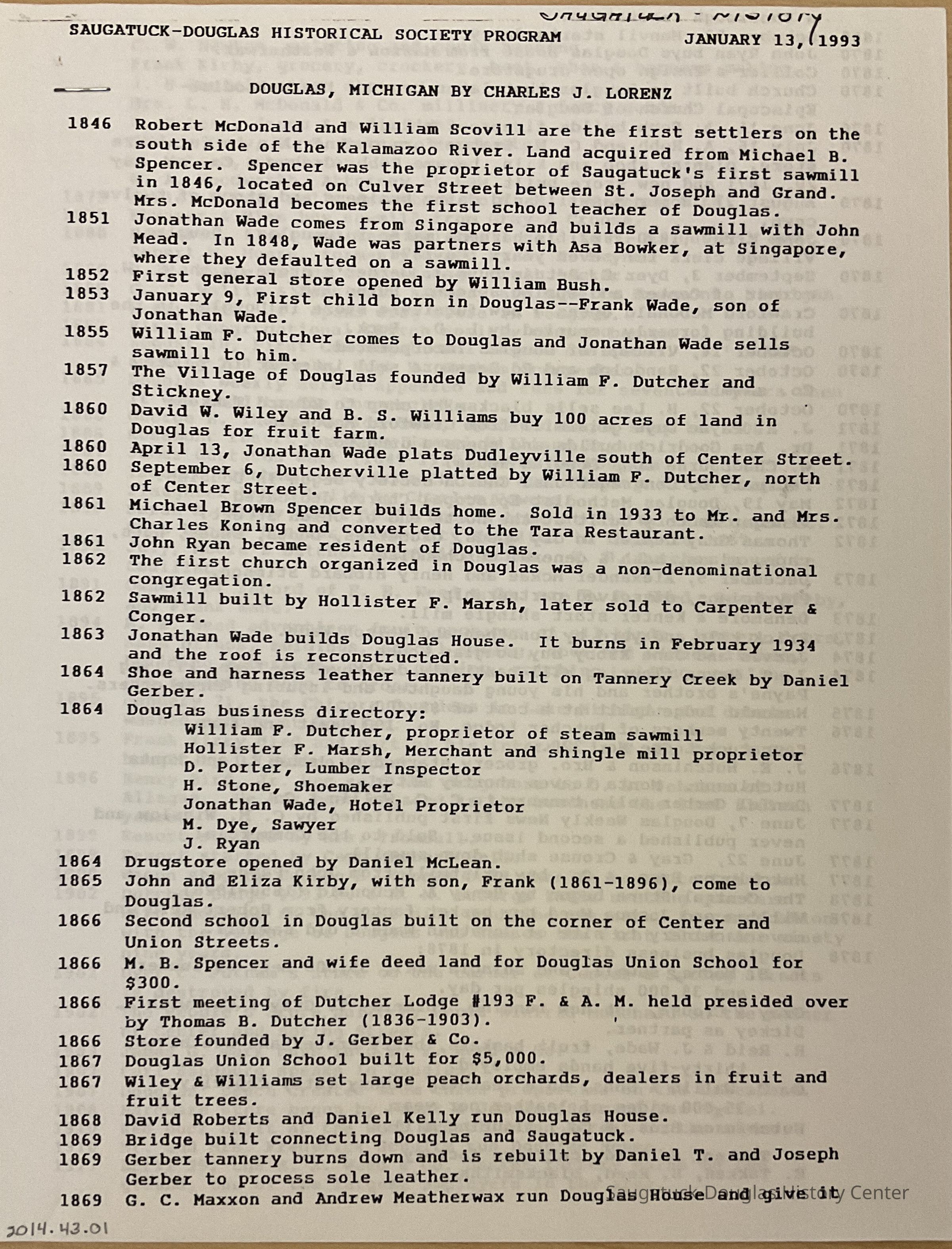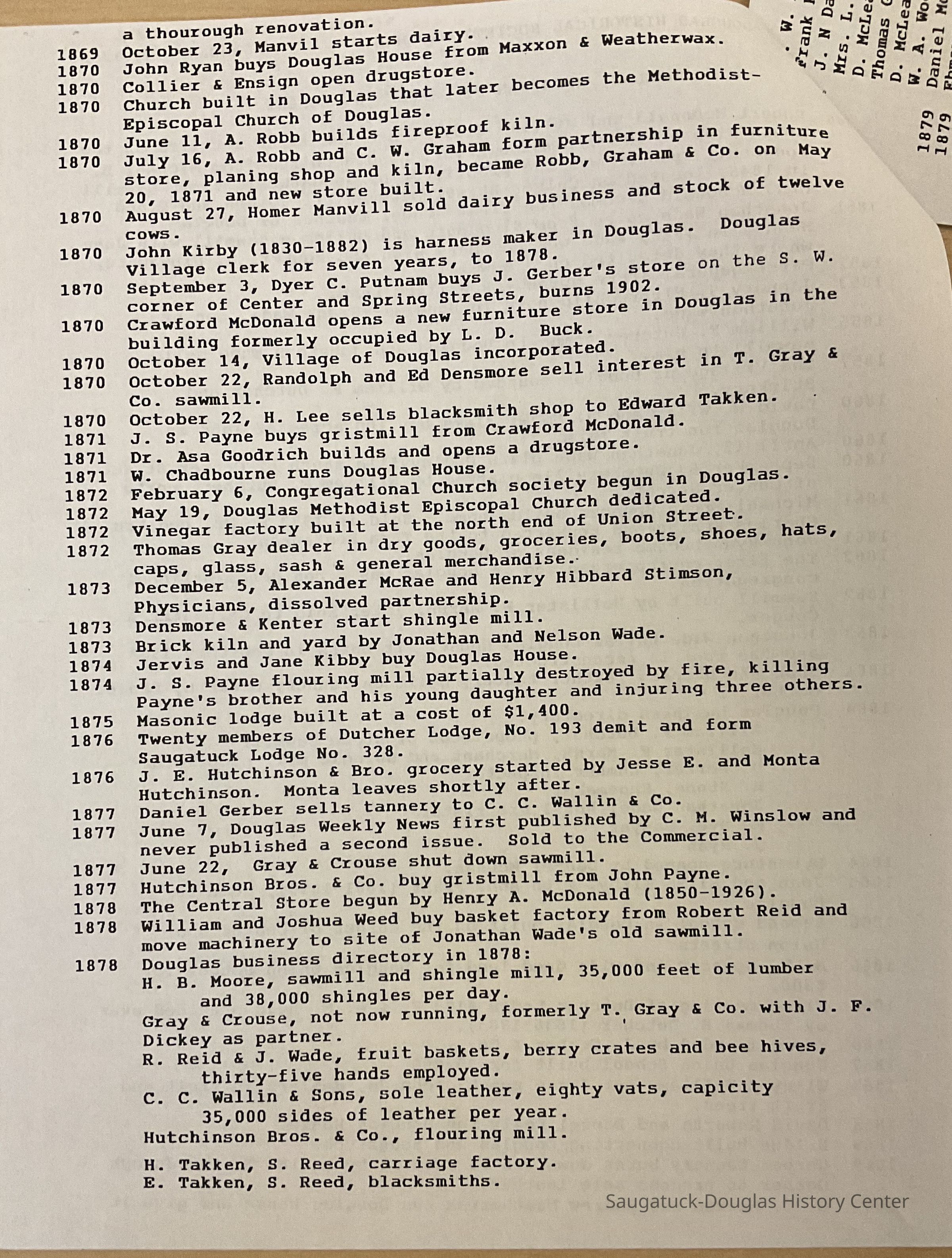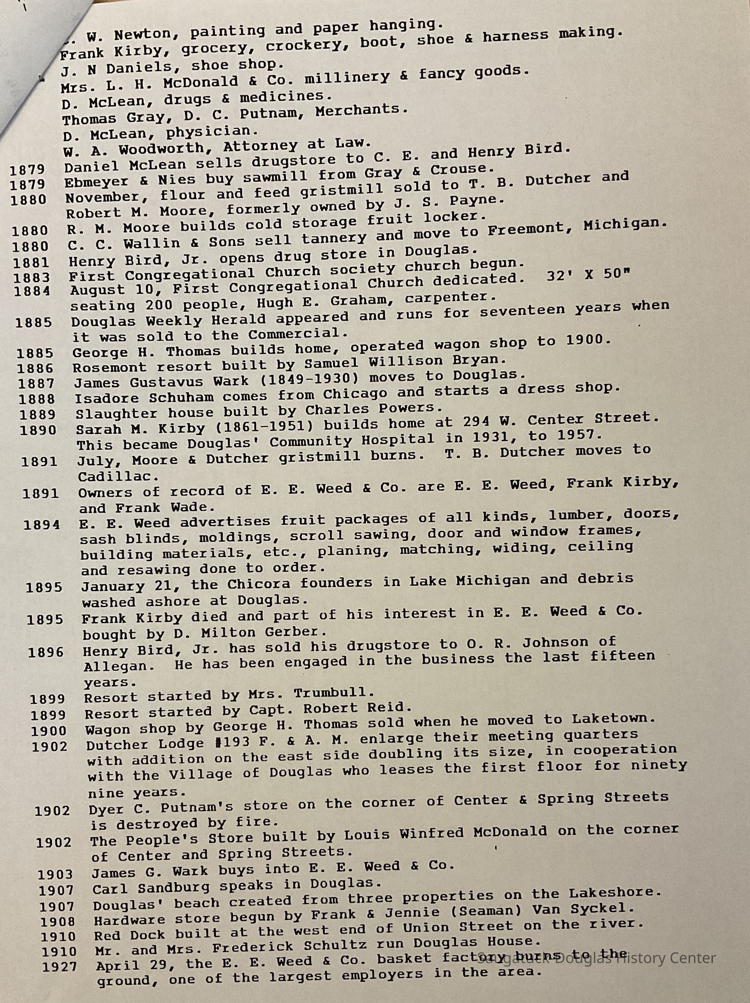 A history of Saugatuck and Douglas in chronological order from 1846-1927 (3 pages)Cataloged By