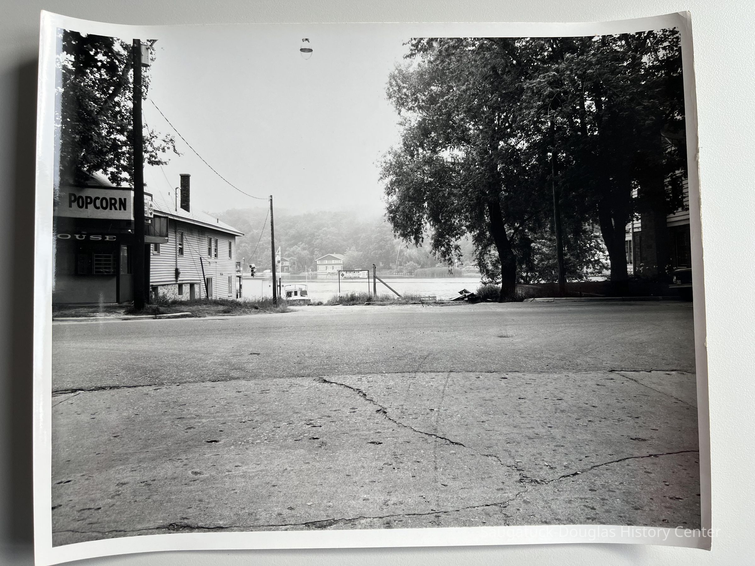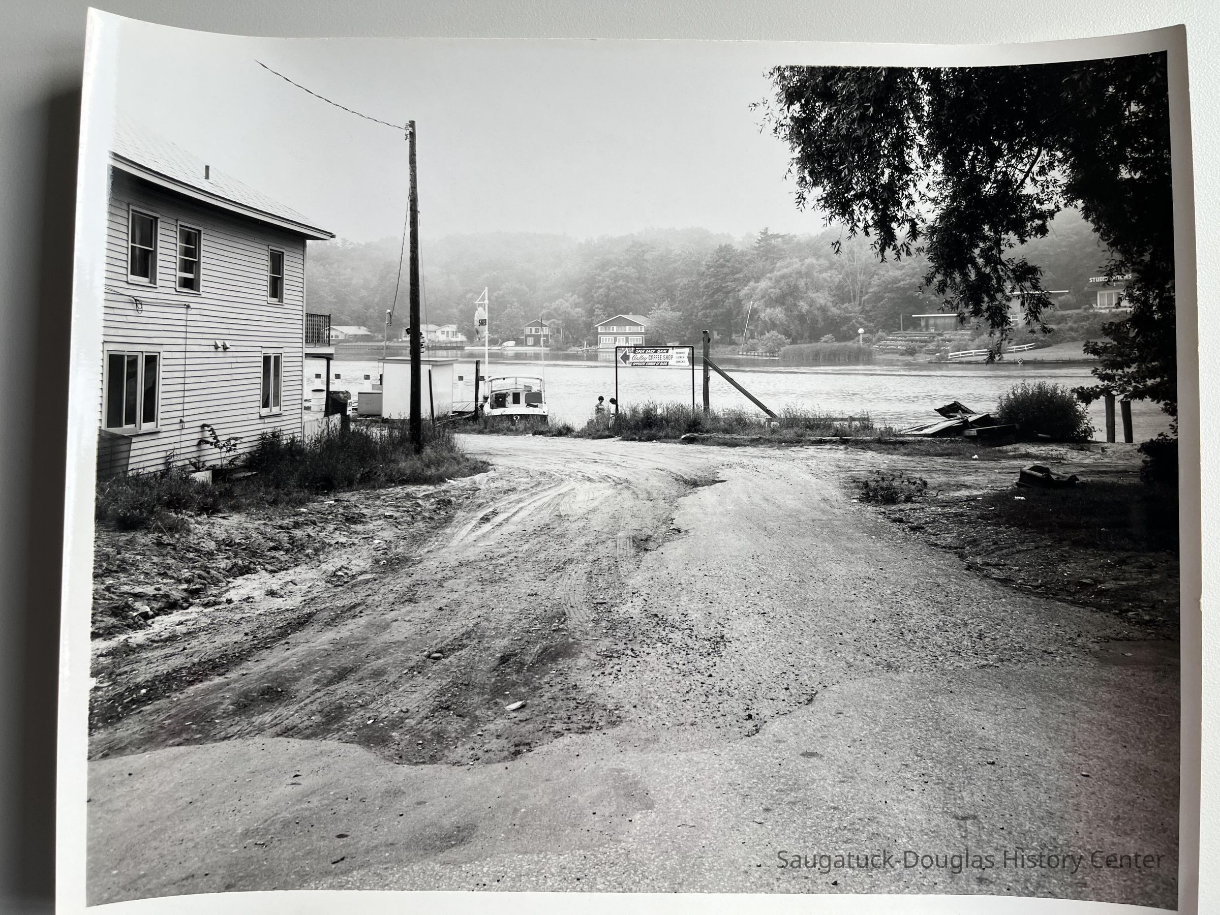 Photos show the Hoffman Street ending, just north of the Coral Gables Annex. Directional sign at the end of the street points the way to the Gallery Coffee Shop. Shell boat gas dock and cottages across the Kalamazoo River on Park Street are visible.Photograph Details