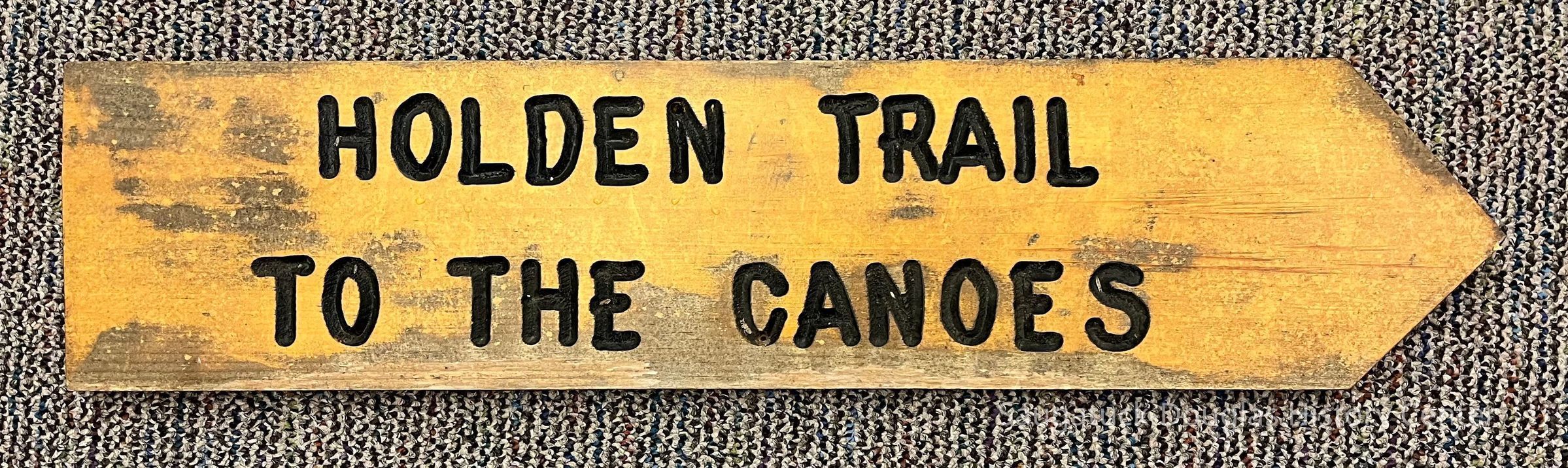Wooden Presbyterian camp arrow-shaped sign with the text "Holden Trail to the Canoes" routed into the wood substrate and filled in with black paint.Collection