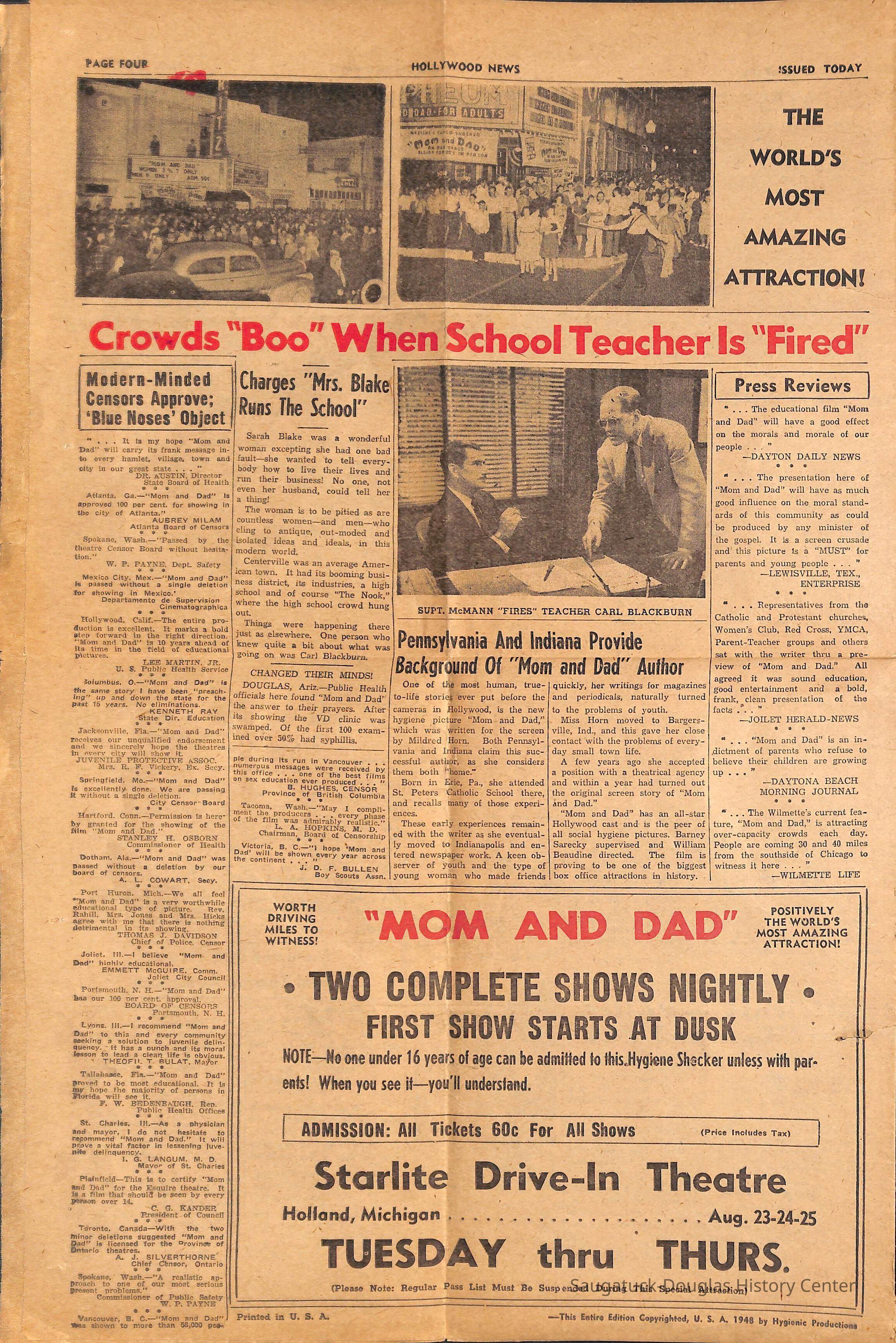 Advertising, Hollywood, Newspaper, Marketing, Public Relations, Saugatuck, Michigan, Holland, Michigan, Starlight, Starlite, Blue Star Highway, History of Film, Hygene film, Movie, Moral panic, sex education