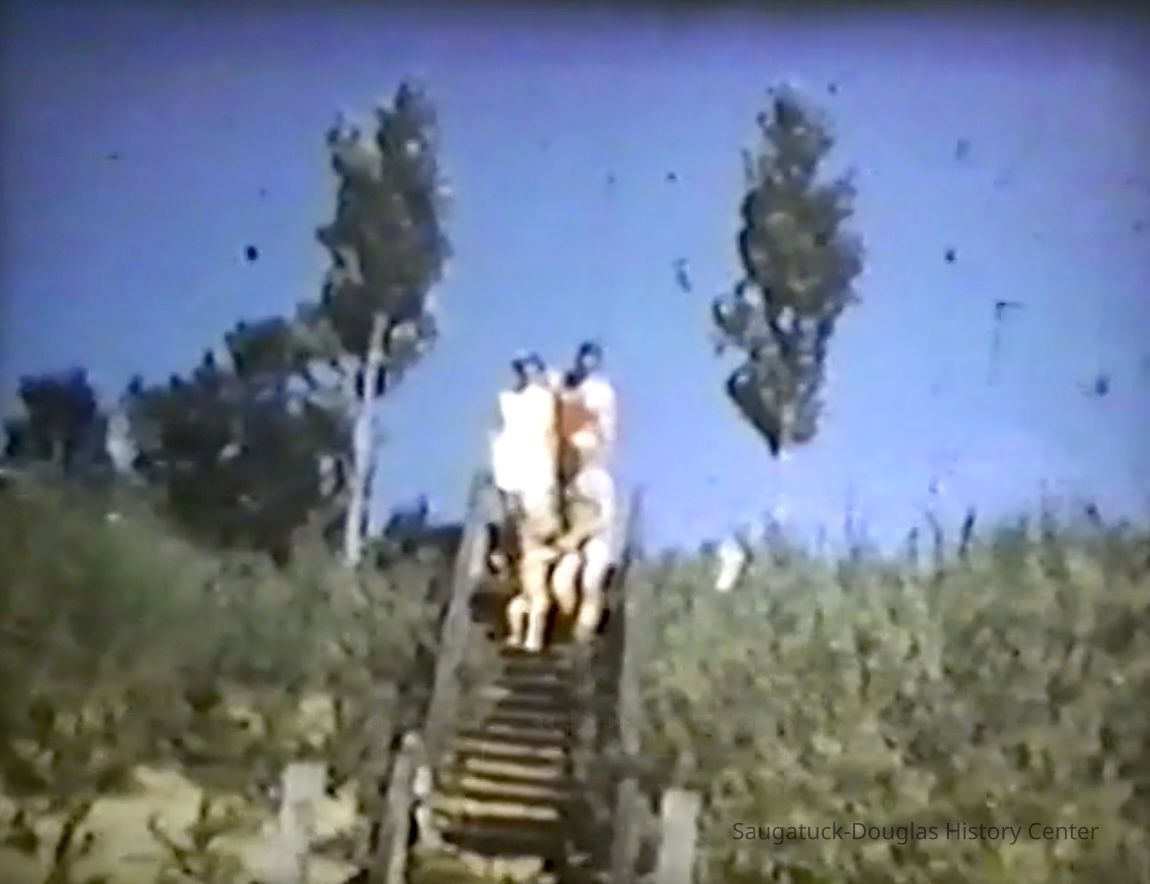 "Moments to Remember" compilation of color home movies filmed at Oval beach, views of fish tugs, view of Big Pavilion from Mount Baldhead, the Blue Star Highway Bridge and the Saugatuck palette sign. 4 minutes. Accompanied by "I Get Around" by the Beach Boys.