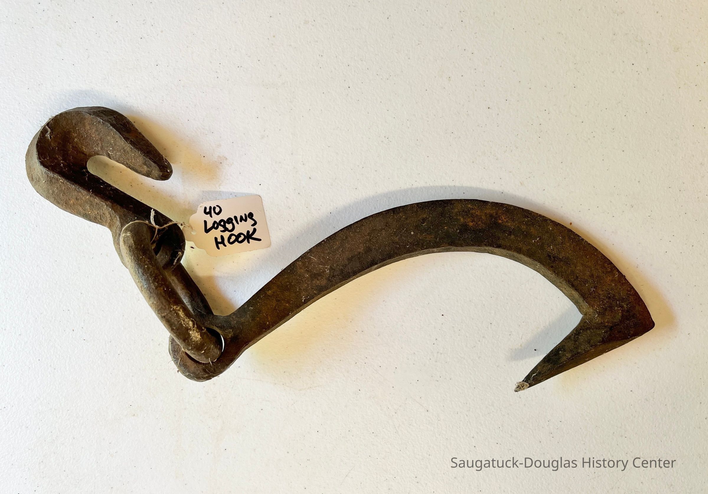 Iron hook with large hook on one end, small hook on the other end, and a ring attaching the two.Collection