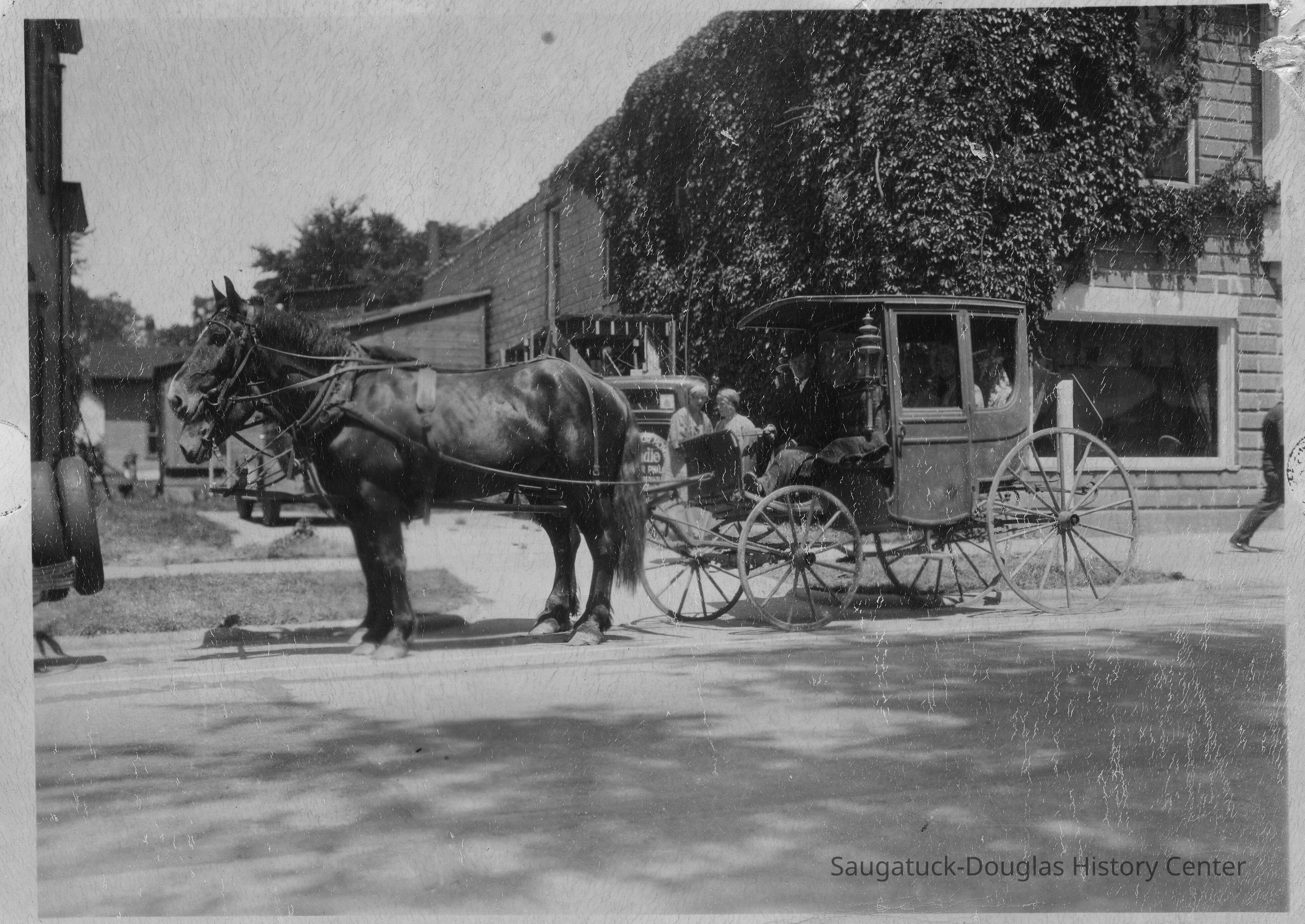a. Two women in a carriage harnessed to two dark horses. A driver wearing a suit and top hat is holding the reins. Two young women wearing headbands are standing on the sidewalk nearby. Behind them is a 1930/40s era car with writing on the rear, spare tire cover and a cement-block building (like Reed's Livery) that is covered in vines and has a large plate-glass window and attached shed. Location unknown.
