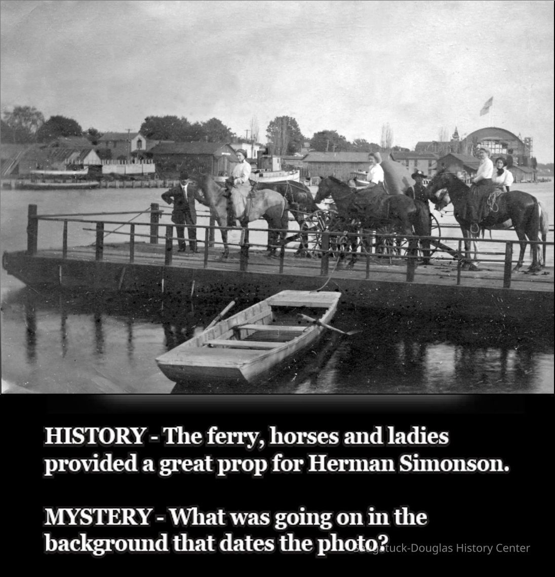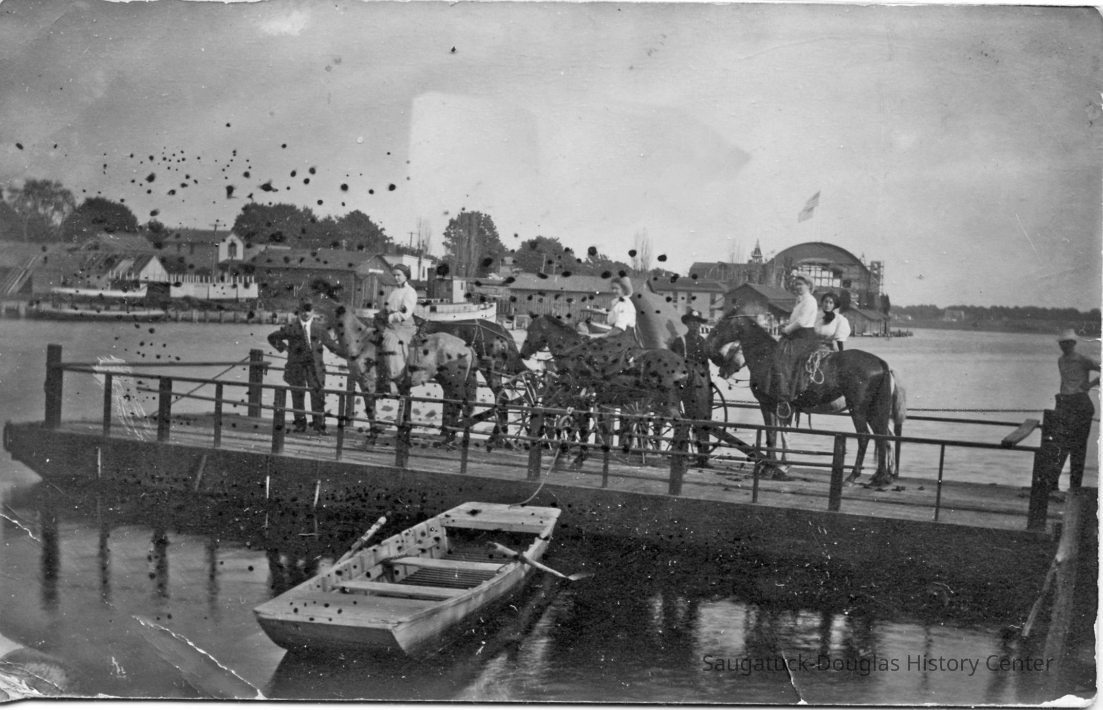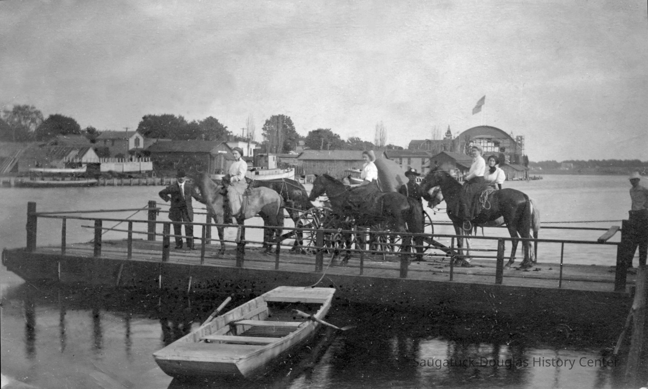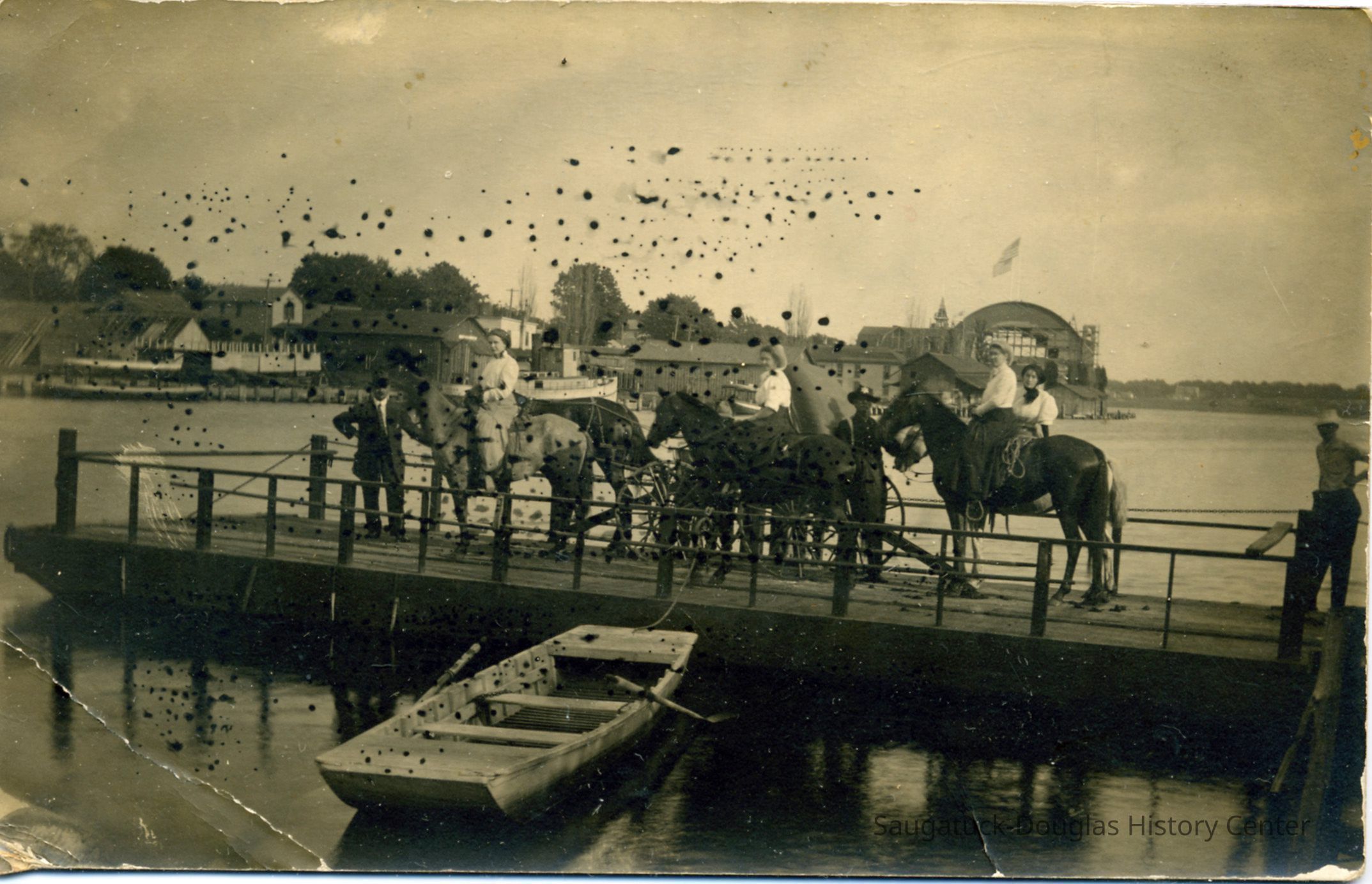 This image was featured as History Mystery # with the solution: The early Saugatuck ferry often carried horses and riders. The photo was taken in 1909 with the Big Pavilion, shown in the background, still under construction.Photograph Details