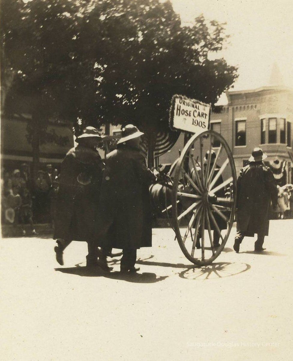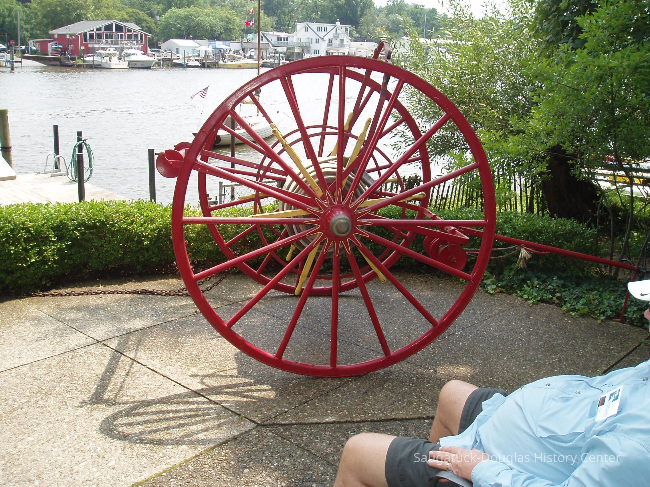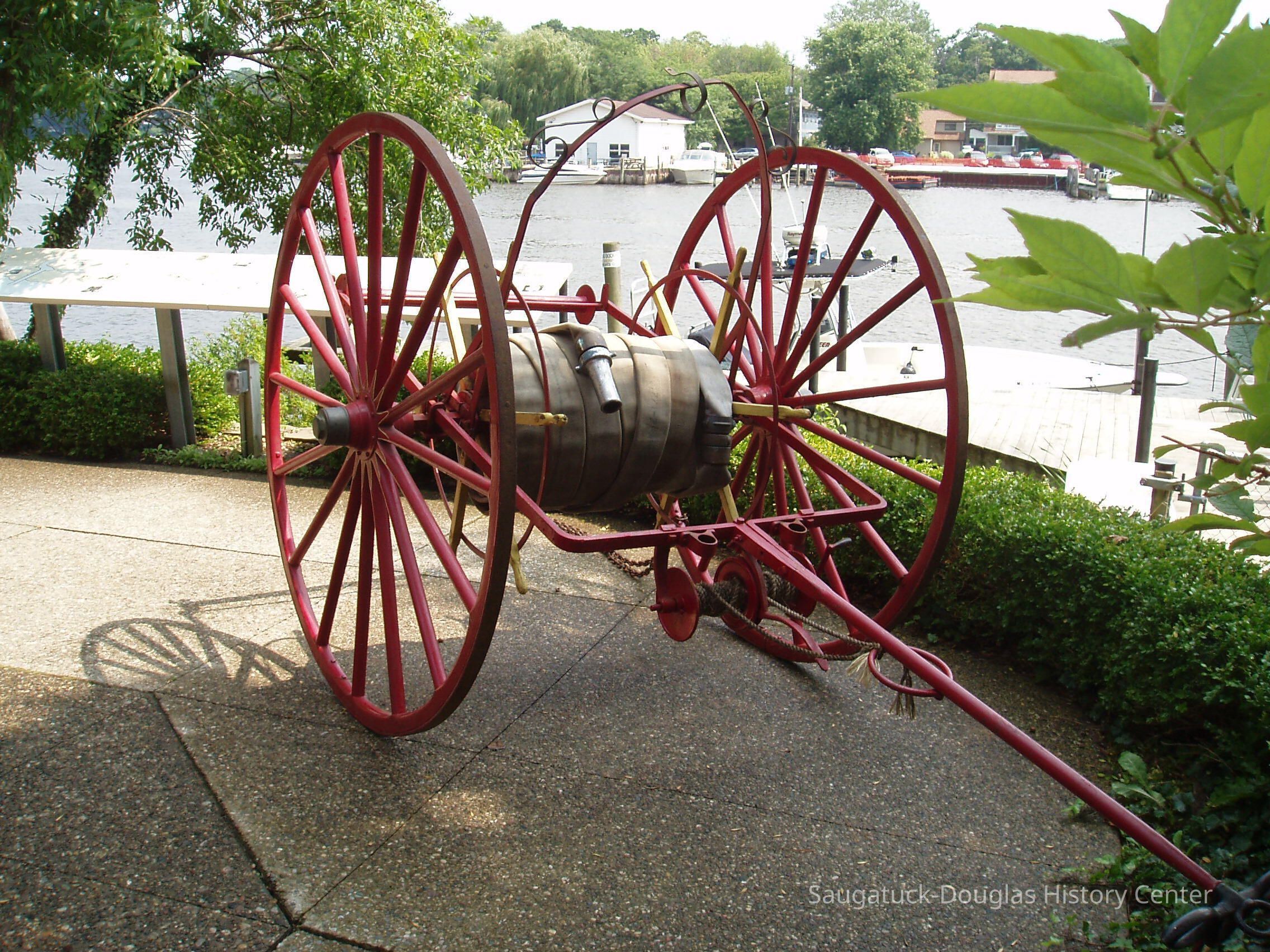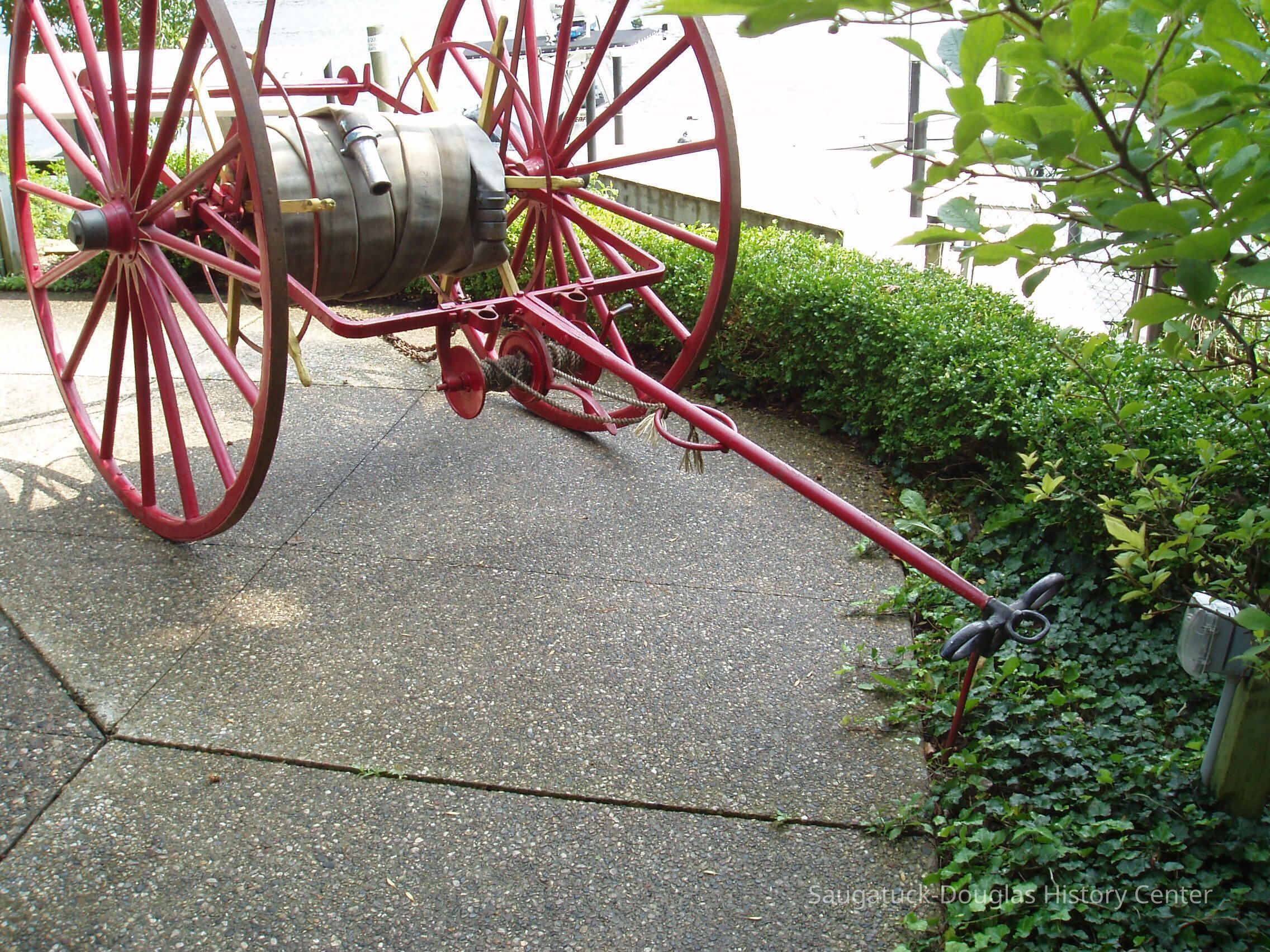 A 1923 era fire hose cart used by the Saugatuck's Fire Department. The hose reel has been returned to the Saugatuck Township Fire District.Collection
