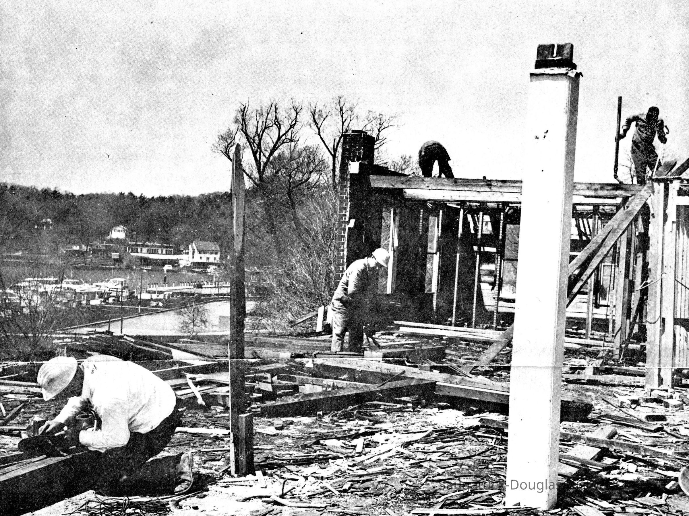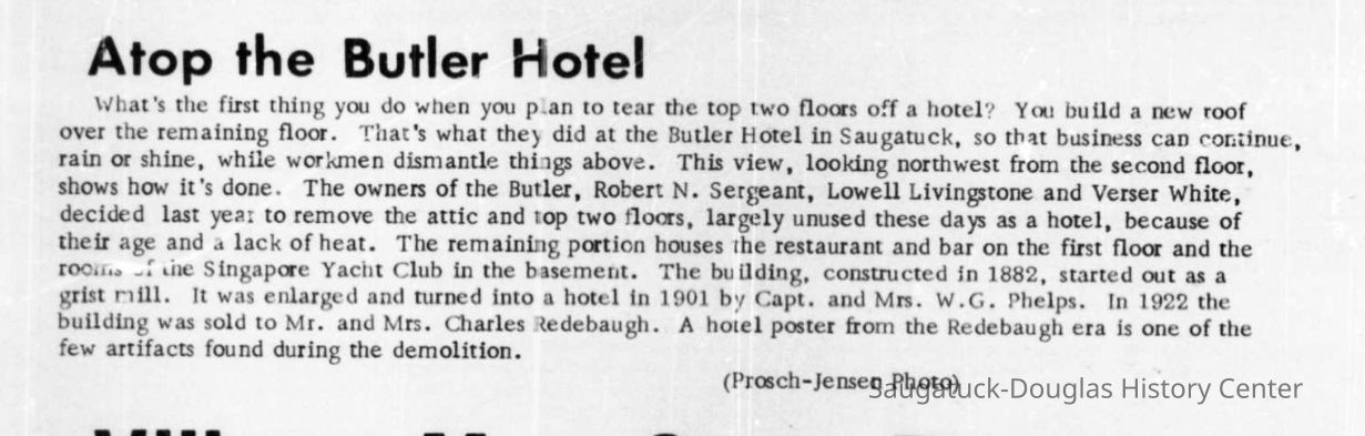 What's the first thing you do when you plan to tear the top two floors off a hotel? You build a new roof over the remaining floor. That's what they did at the Butler Hotel in Saugatuck, so that business can continue, rain or shine, while workmen dismantle things above. This view, looking northwest from the second floor, shows how it's done. The owners of the Butler, Robert N. Sergeant, Lowell Livingstone and Verser White, decided last year to remove the attic and top two floors, largely unused these days as a hotel, because of their age and a lack of heat. The remaining portion houses the restaurant and bar on the first floor and the rooms of the Singapore Yacht Club in the basement. The building, constructed in 1882, started out as a grist mill. It was enlarged and turned into a hotel in 1901 by Capt. and Mrs. W.G. Phelps. In 1922 the building was sold to Mr. and Mrs. Charles Redebaugh. A hotel poster from the Redebaugh era is one of the few artifacts found during the demolition.