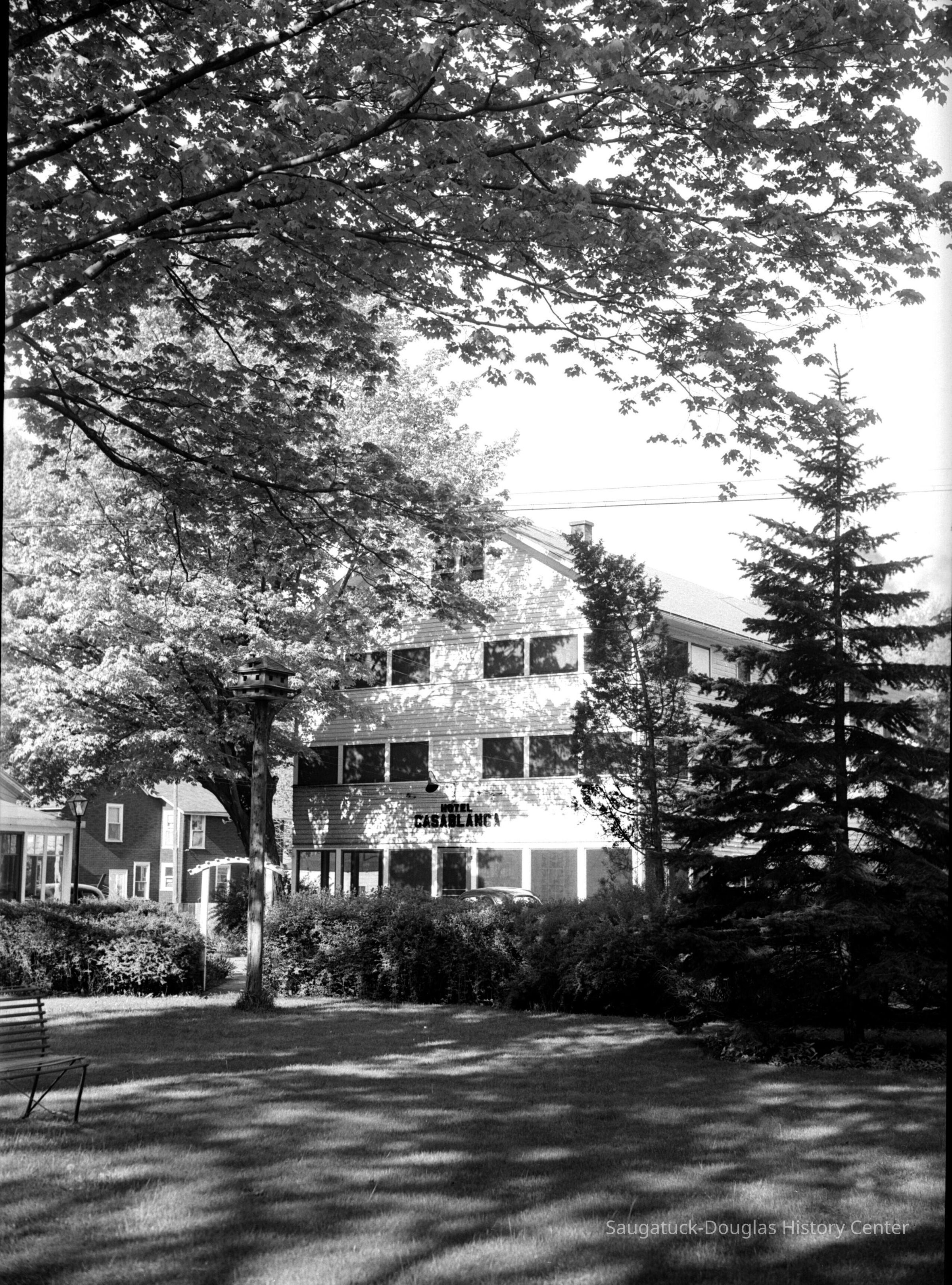 Exterior of Hotel Casablanca. The building, located on the Village Square by Christian Science Church was destroyed by fire in March, 1969.