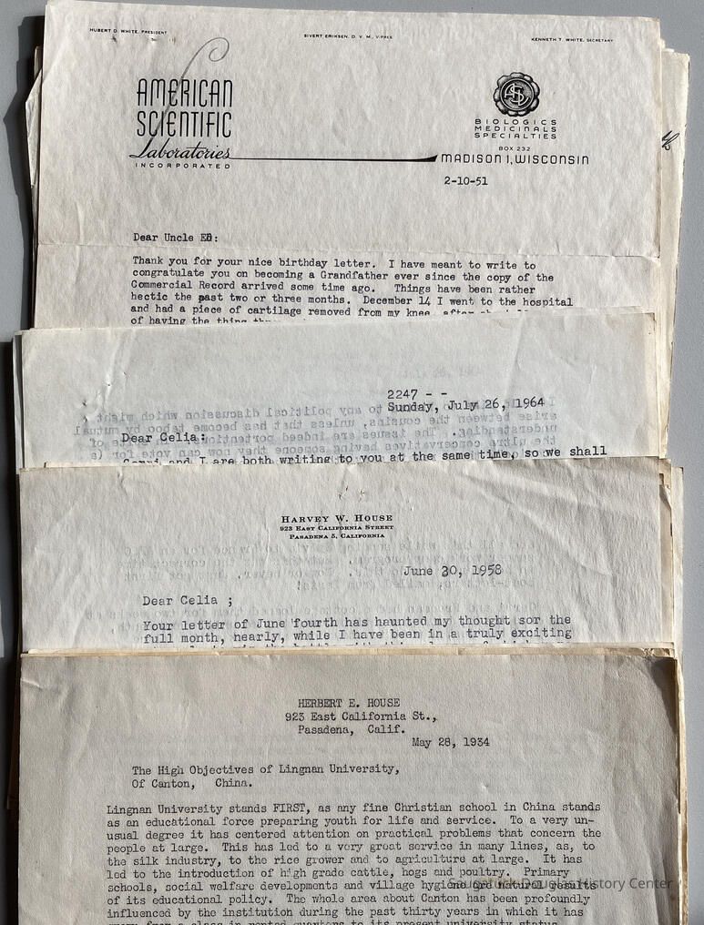 Letters from Herbert House who lived in Pasedena, California to Edwin House (his brother) -- 1930s about Lingnan University in Canton, China; his boyhood impression of Saugatuck when the family first arrived in 1868; travels; cooperatives; copy of letter to son Harvey about meeting with Pearl Buck (author) and John Day Books; Jessie's illness in 1950; a visit from refugee Czechoslovakians in 1953; desire for a little cottage on the family farm in Saugatuck,