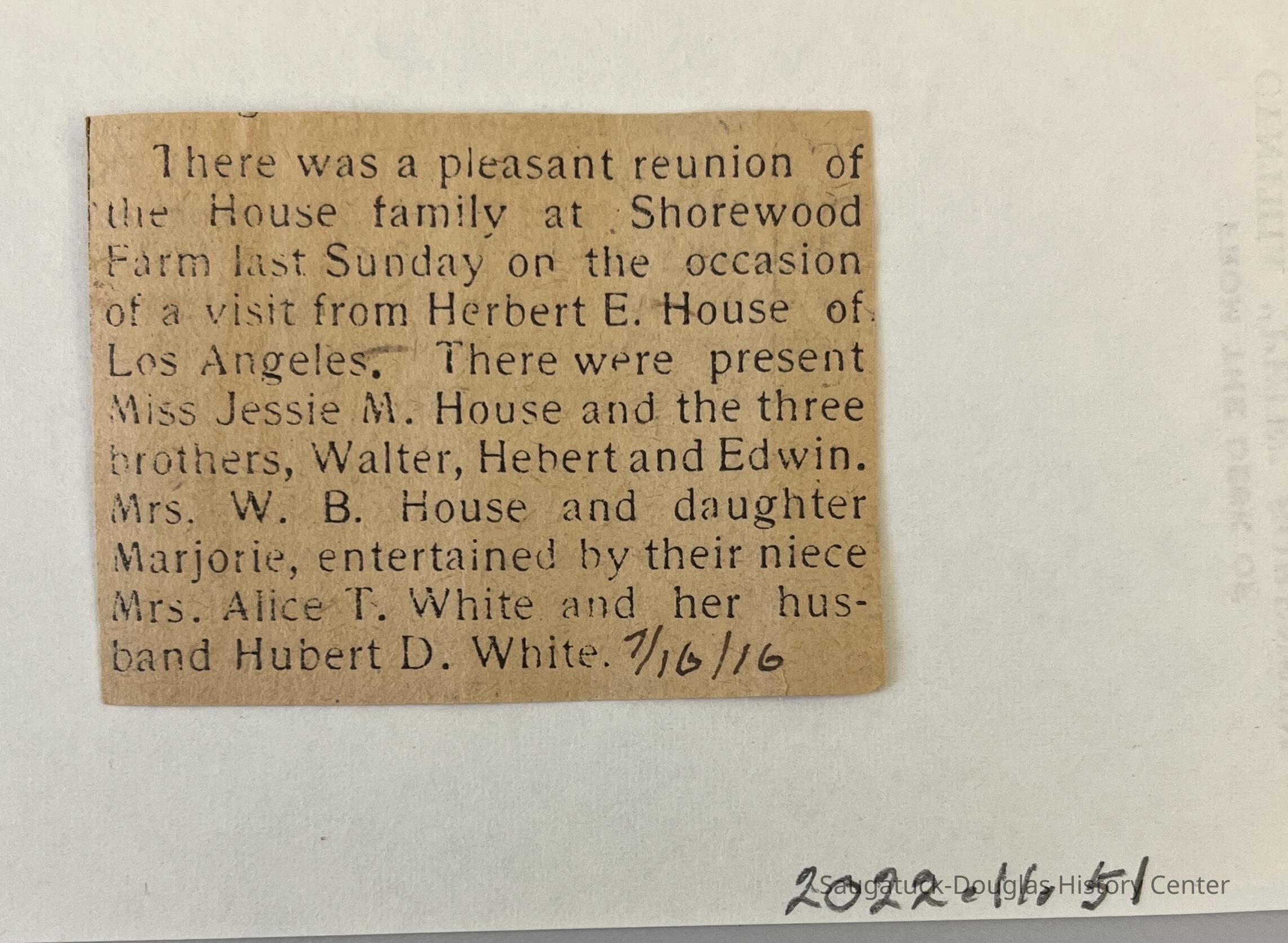 Newspaper clipping about House family reunion at Shorewood Farm on the occasion of a visit from Herbert House (Edwin's brother) of Los Angeles (Pasedena).
