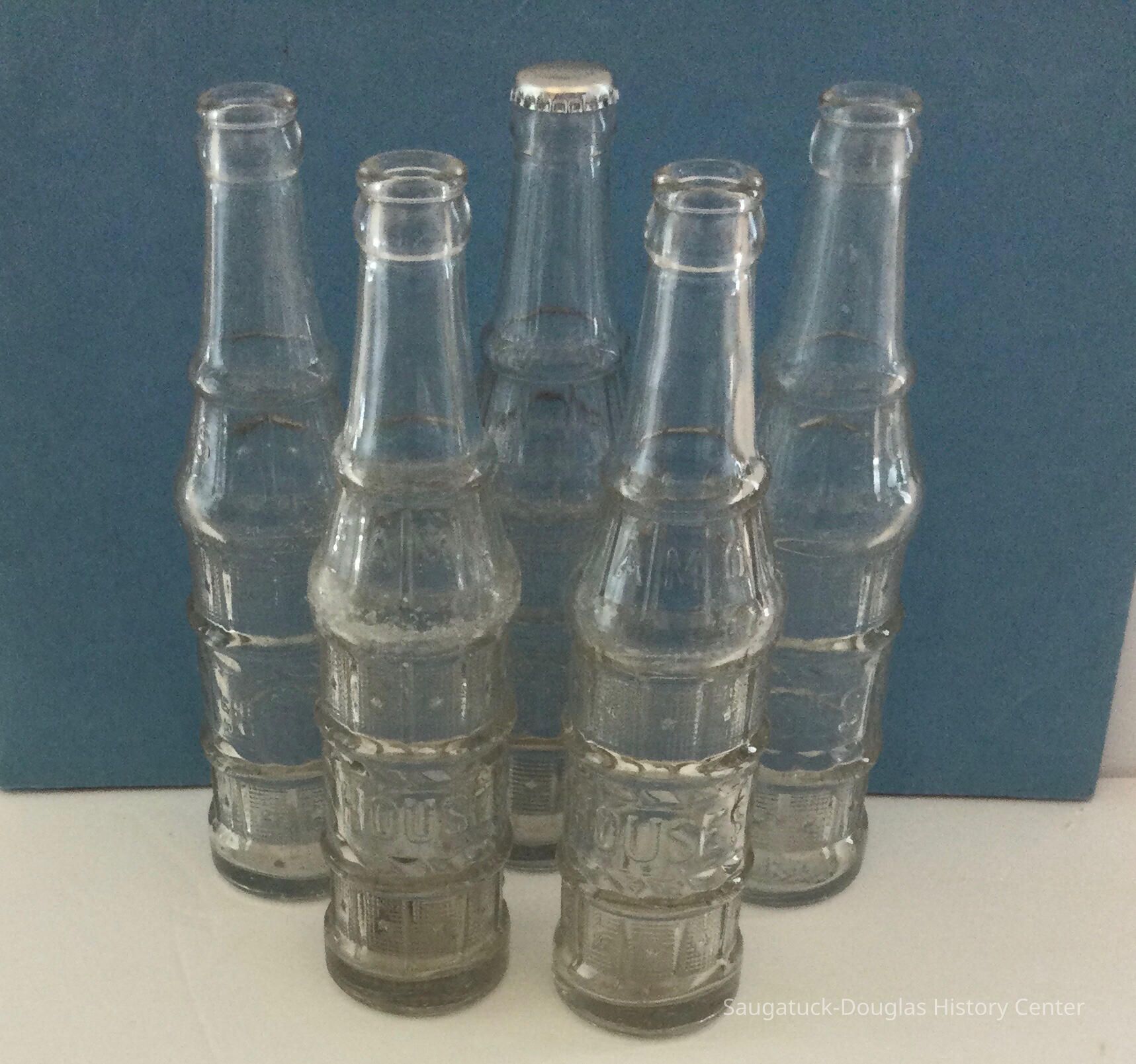 Five 8 ounce (approx.) Houses Cherry Cider glass bottles. Bottle has the words “Famous” , Houses, Cherry Cider Co and Saugatuck, Michigan shown.Cataloged By