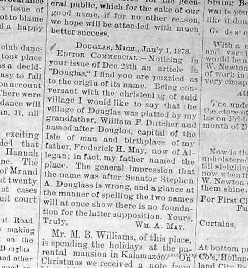 “Noticing in your issue of Dec. 28th an article on ‘Douglas,’ I find you are puzzled as to the origin of its name. Being conversant with the christening of said village, I would like to say that the village of Douglas was platted by my grandfather, William F. Dutcher, and named after Douglas, capital of the Isle of Man and birthplace of my father, Frederick H. May, now of Allegan; in fact, my father named the place. The general impression that it is named after Senator Stephen A.Douglass is wrong and a glance at the manner of spelling the two names will at once show there is no foundation to the latter supposition.”Context