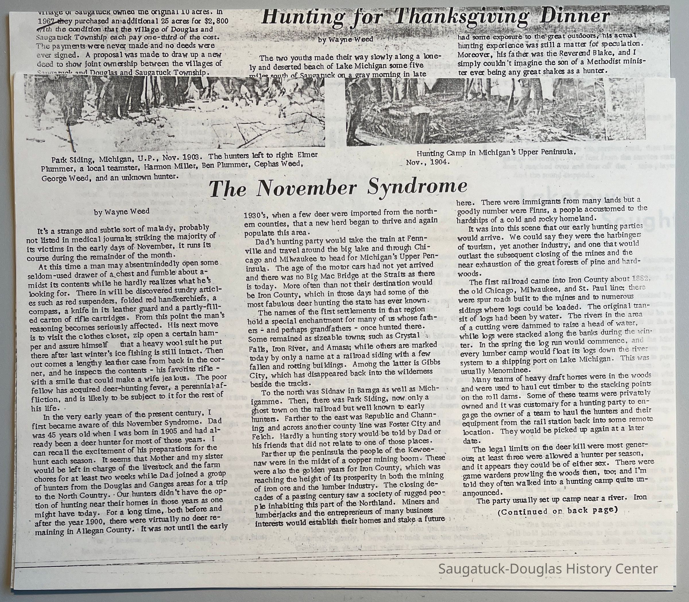 Two photocopies of Commercial Record newspaper articles by Wayne Weed about hunting titled "The November Syndrome" and "Hunting for Thanksgiving Dinner."