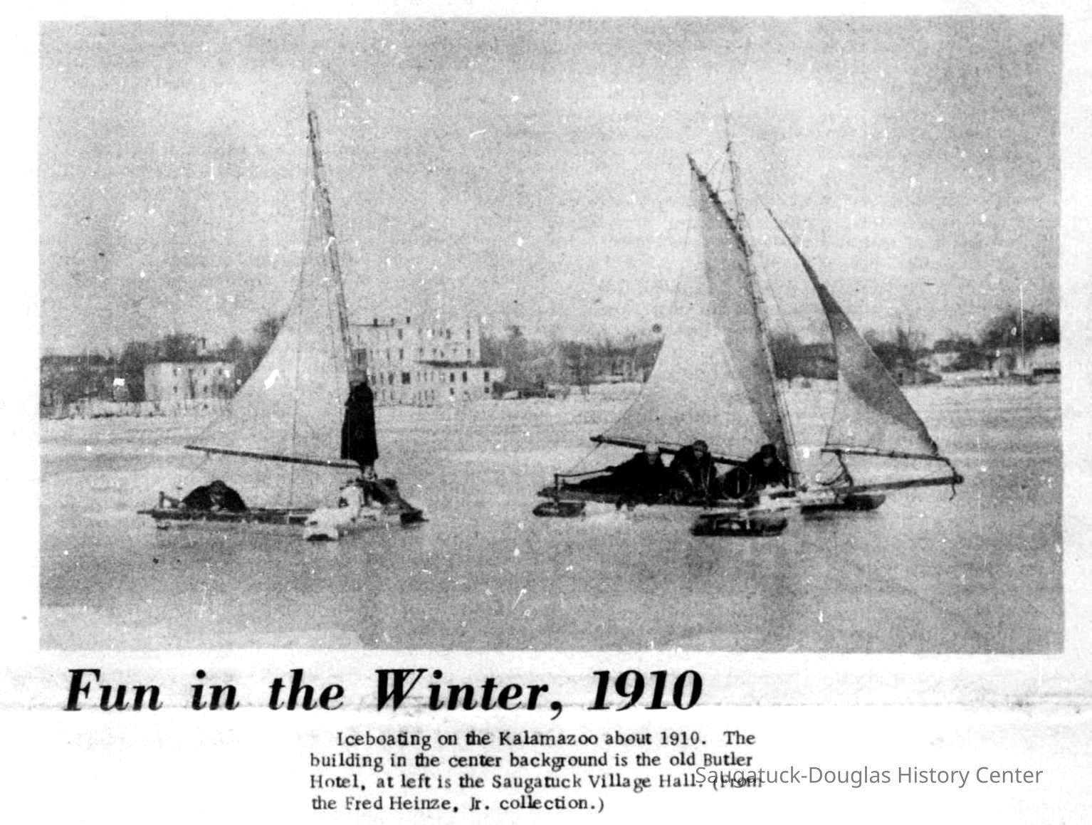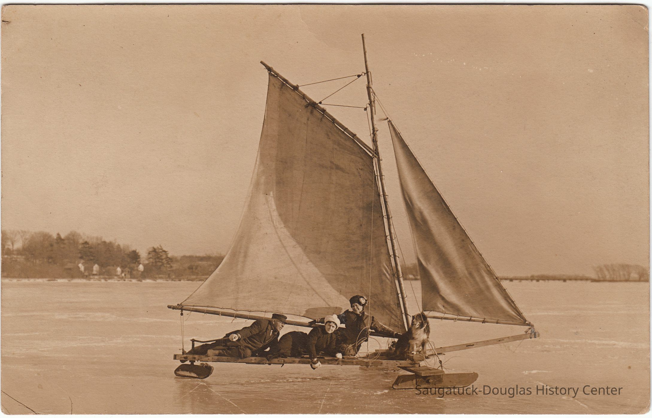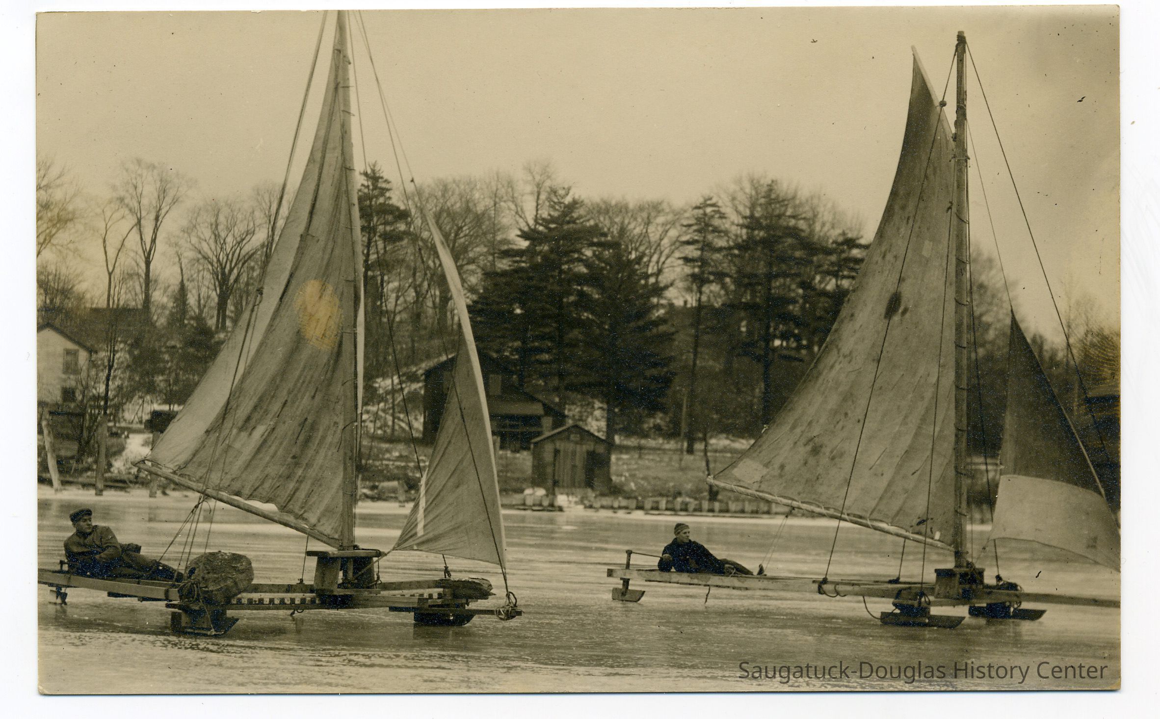 Digital scans of people on sleds with sails used to speed over the frozen surface of Lake Kalamazoo and an article about the winter activity from the Commercial Record. All photo from the Jack Sheridan hard drive.Photograph Details