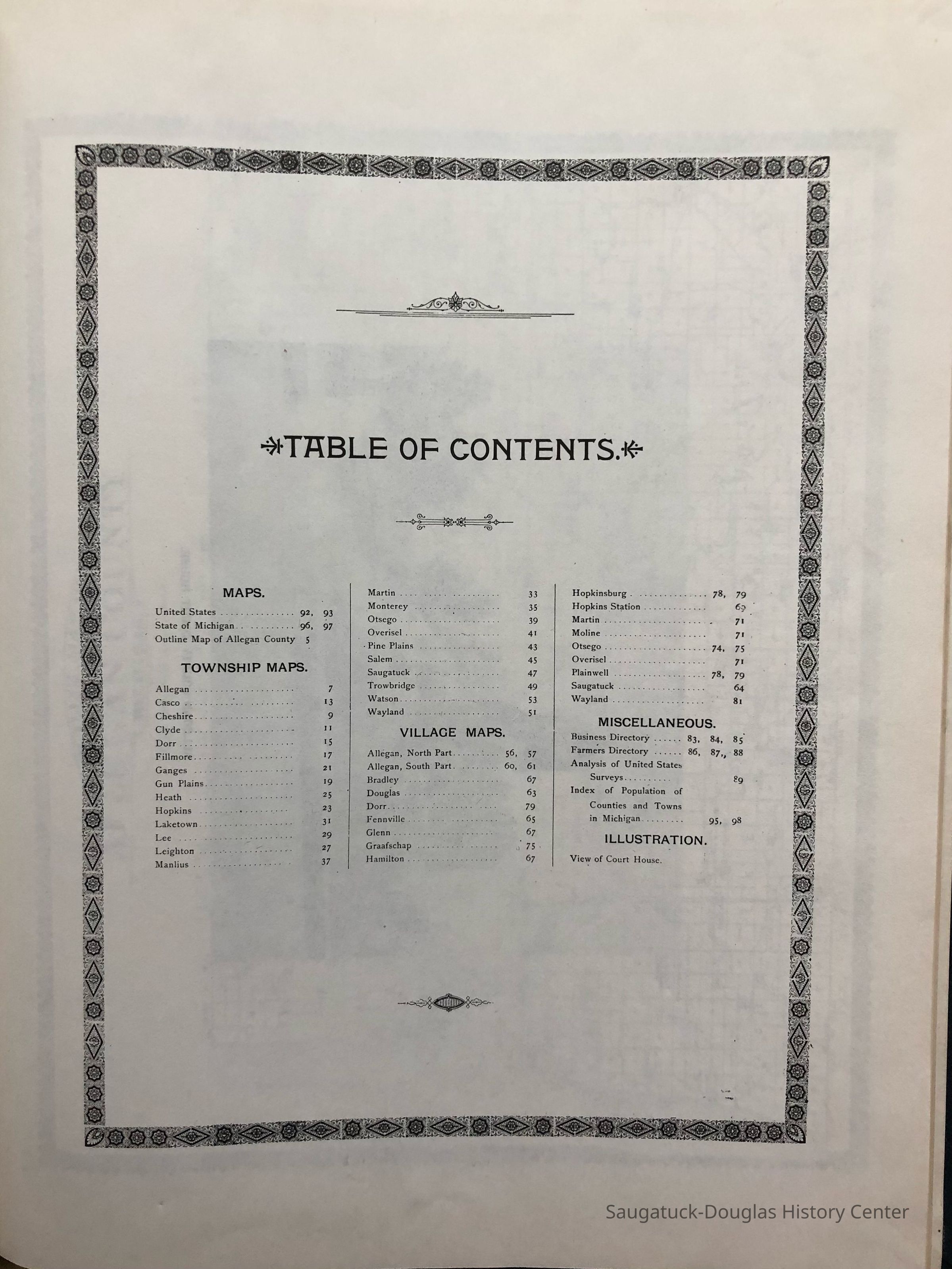 A complilation of Allegan County Township maps, village maps, a business directiory, farmers directory, analysis of United States population of Counties and Towns in Michigan around 1895.Cataloged By
