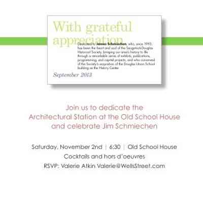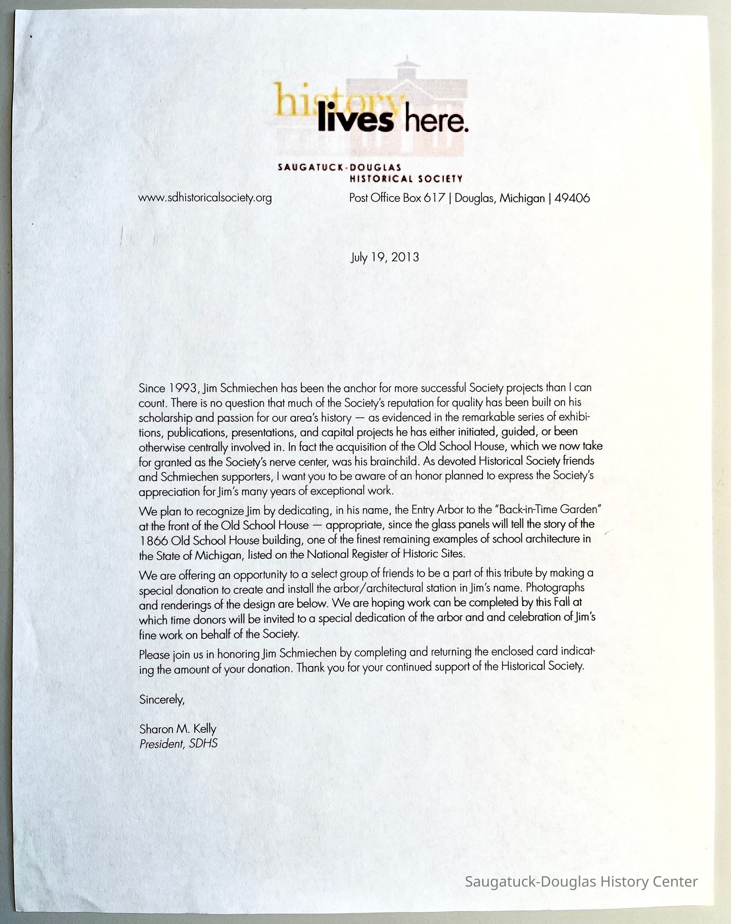 Since 1993, Jim Schmiechen has been the anchor for more successful Society projects than I can count. There is no question that much of the Society's reputation for quality has been built on his scholarship and passion for our area's history - as evidenced in the remarkable series of exhibi-tions, publications, presentations, and capital projects he has either initiated, guided, or been otherwise centrally involved in. In fact the acquisition of the Old School House, which we now take for granted as the Society's nerve center, was his brainchild. As devoted Historical Society friends and Schmiechen supporters, I want you to be aware of an honor planned to express the Society's appreciation for jim's many years of exceptional work. We plan to recognize Jim by dedicating, in his name, the Entry Arbor to the "Back-in-Time Garden" at the front of the Old School House - appropriate, since the glass panels will tell the story of the 1866 Old School House building, one of the finest remaining examples of school architecture in the State of Michigan, listed on the National Register of Historic Sites. We are offering an opportunity to a select group of friends to be a part of this tribute by making a special donation to create and install the arbor/ architectural station in Jim's name. Photographs and renderings of the design are below. We are hoping work can be completed by this Fall at which time donors will be invited to a special dedication of the arbor and and celebration of Jim's fine work on behalf of the Society. Please join us in honoring Jim Schmiechen by completing and returning the enclosed card indicating the amount of your donation. Thank you for your continued support of the Historical Society.