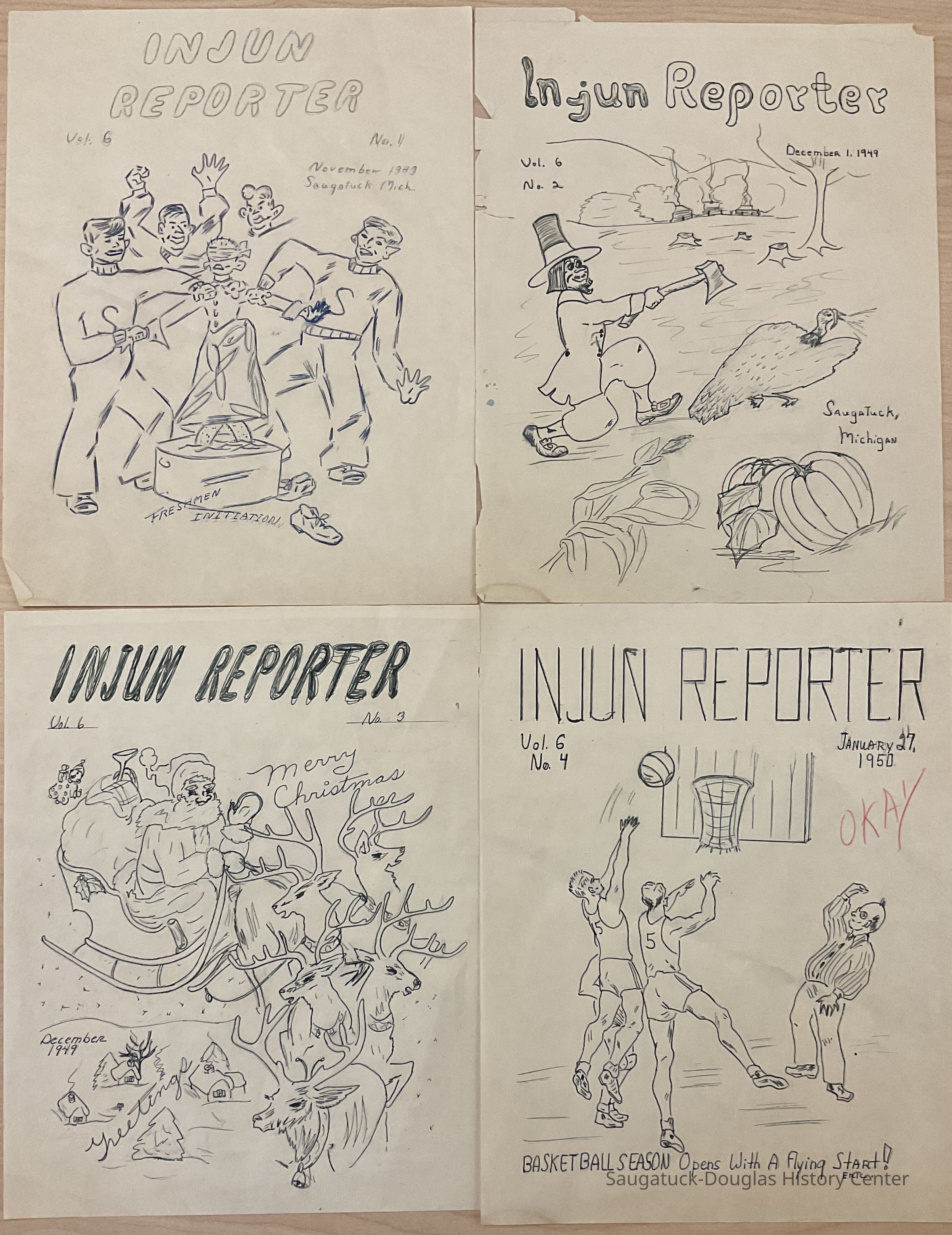 Four handrawn covers for the INJUN Reporter Newspaper for Saugatuck High School.