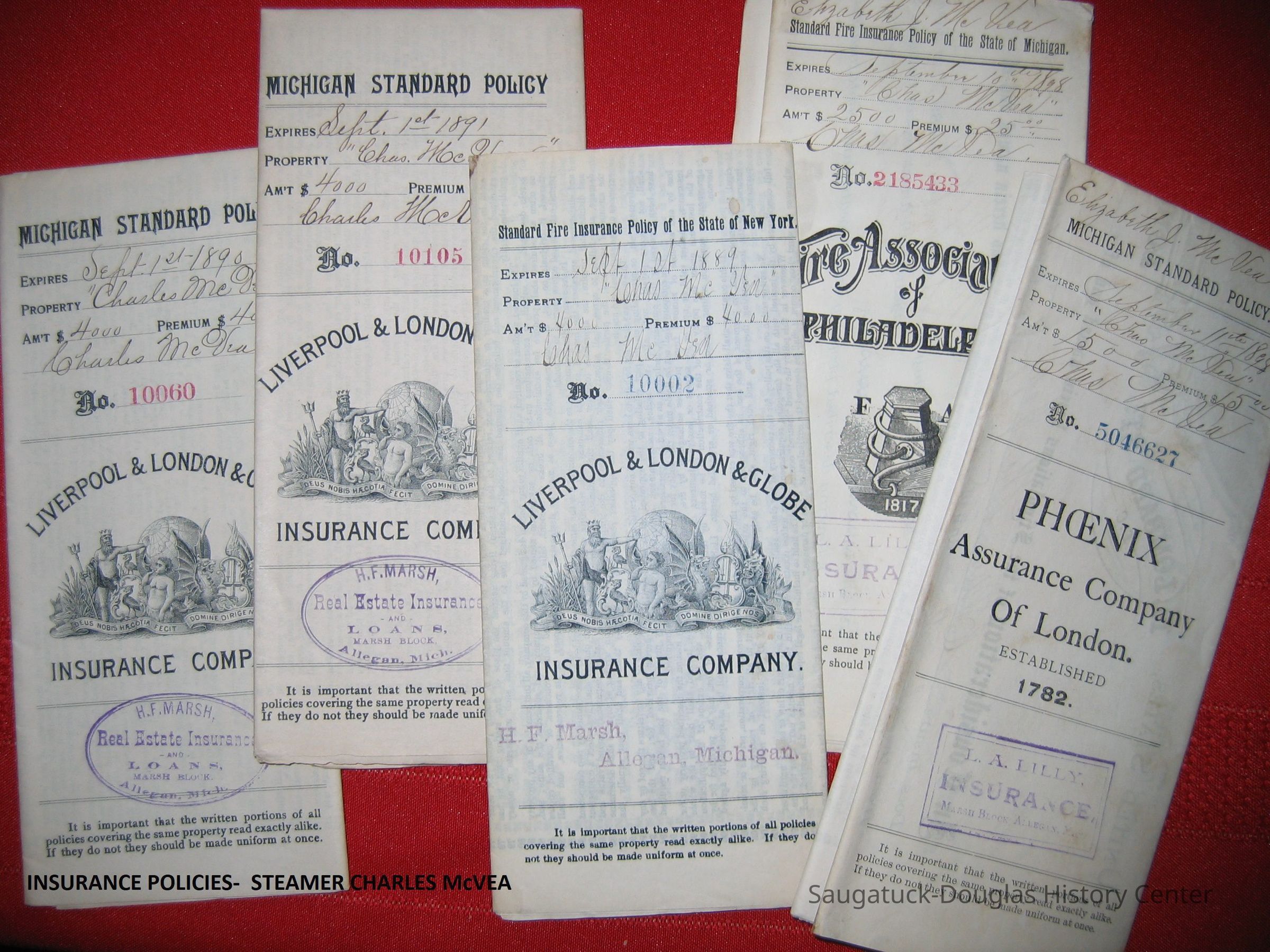 E. 1898 fire insurance policy for Charles McVea (ship) issued by Fire Association of Philadelphia by L.A. Lilly of Allegan.