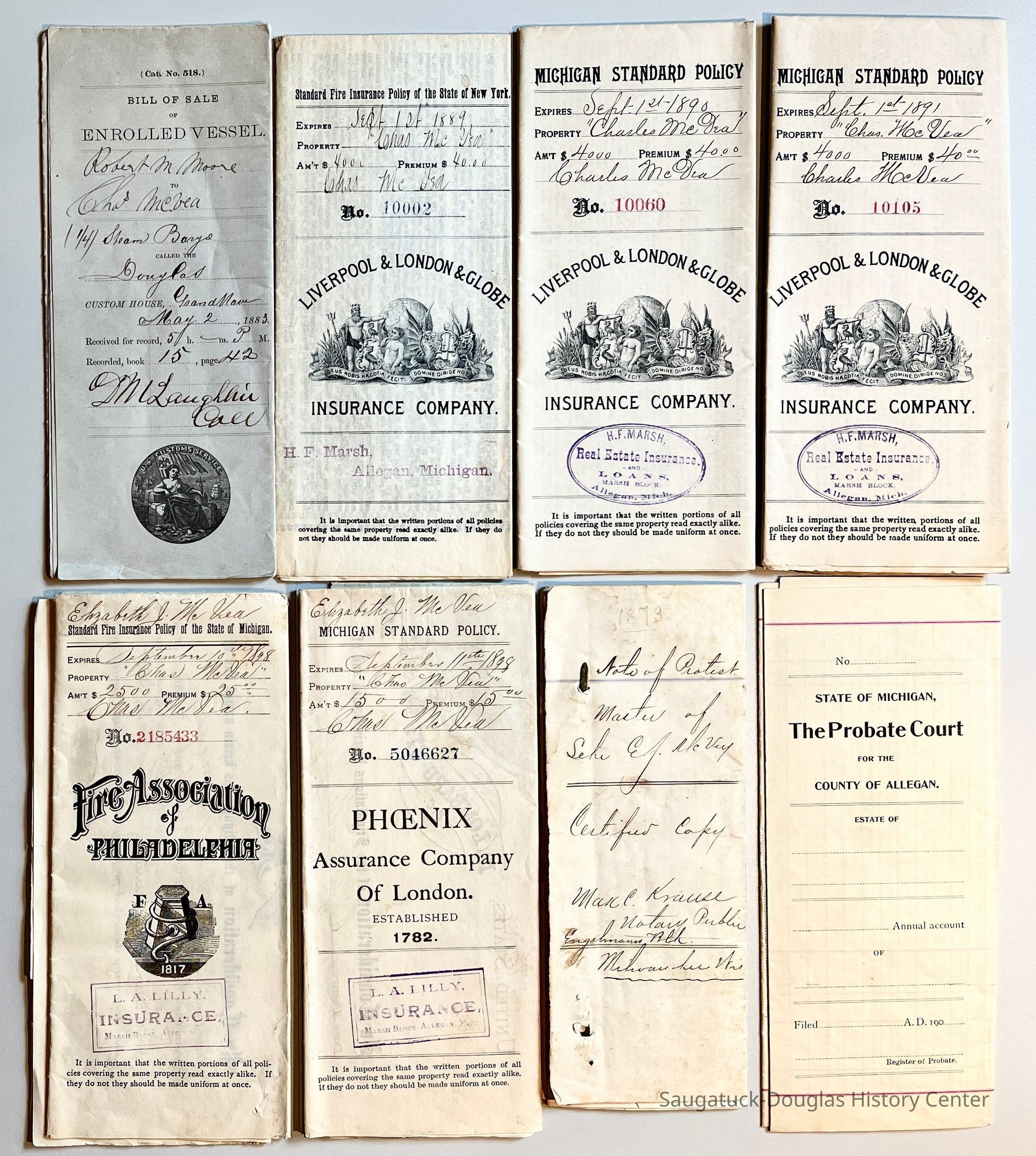 B. 1889 fire insurance policy for Charles McVea (ship) issued by Liverpool & London & Globe Insurance Company by H.F. Marsh of Allegan.