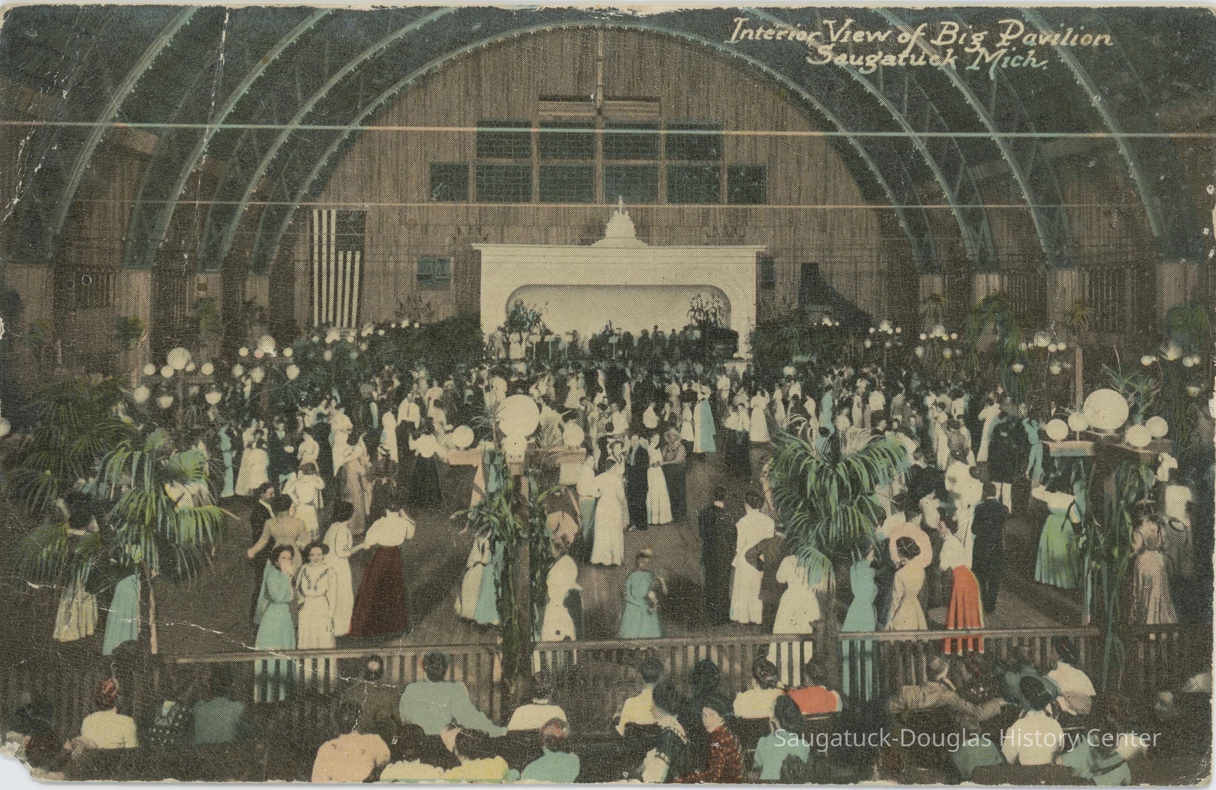 A color postcard showing the inside of the big pavilion with people mingling on the dance floor. A group of people are seated behind a railing watching the festivities.Subject