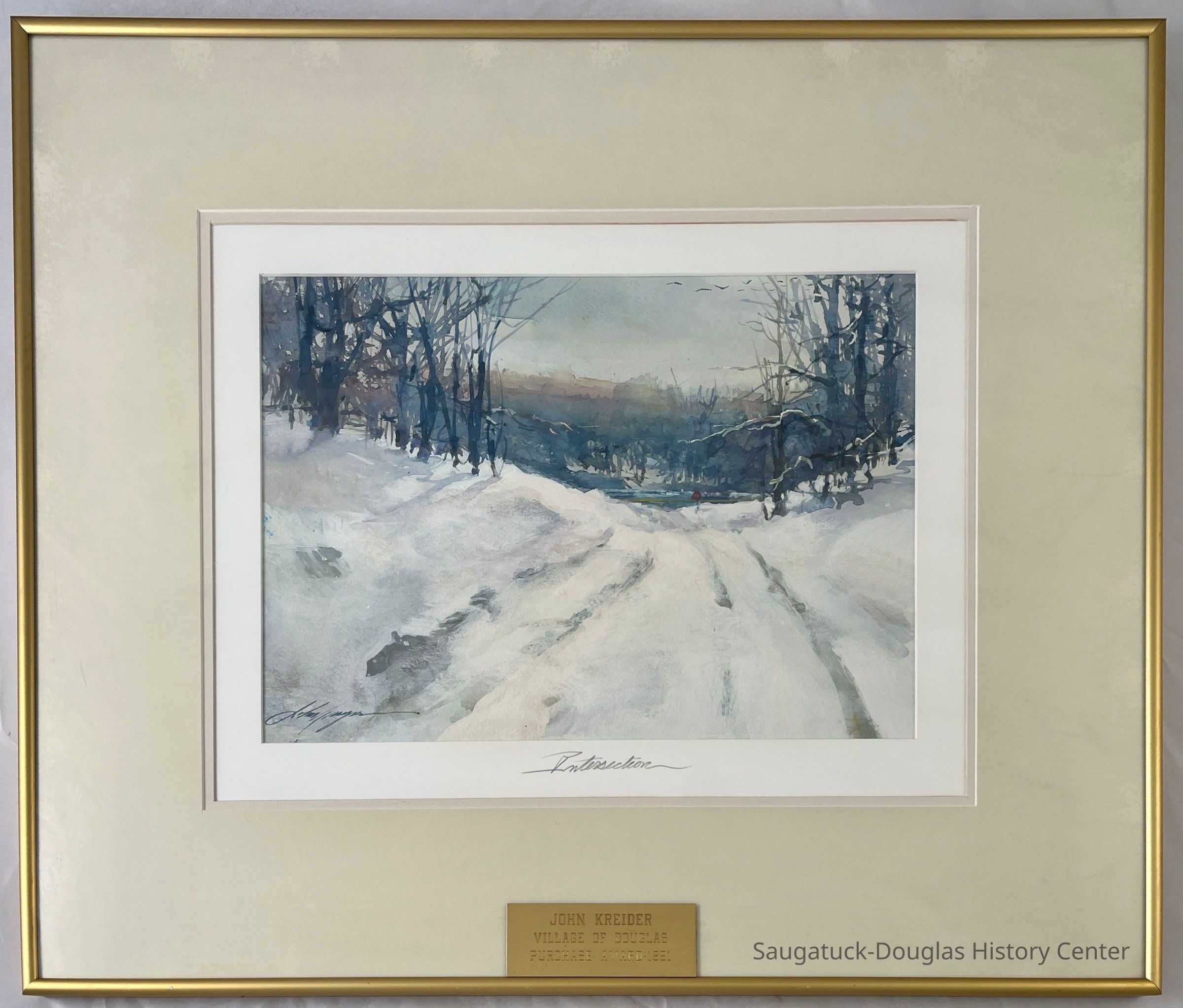 Framed behind glass with a double off-white and single white mats and .25" gold-tone metal frame. Attached to the glass is a gold-tone plaque that reads " John Kreider, Village of Douglas, Purchase Award 1991"Type of Painting