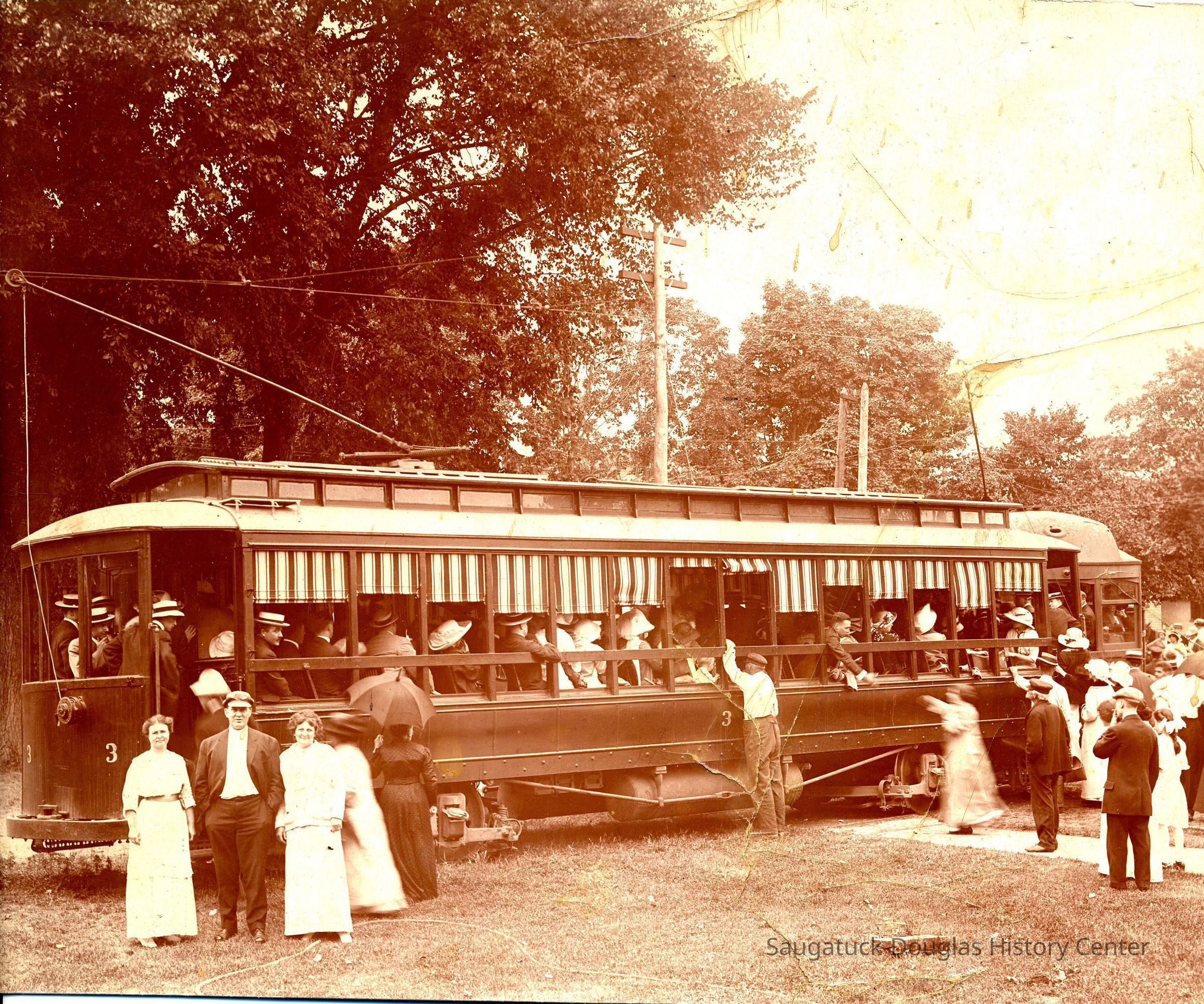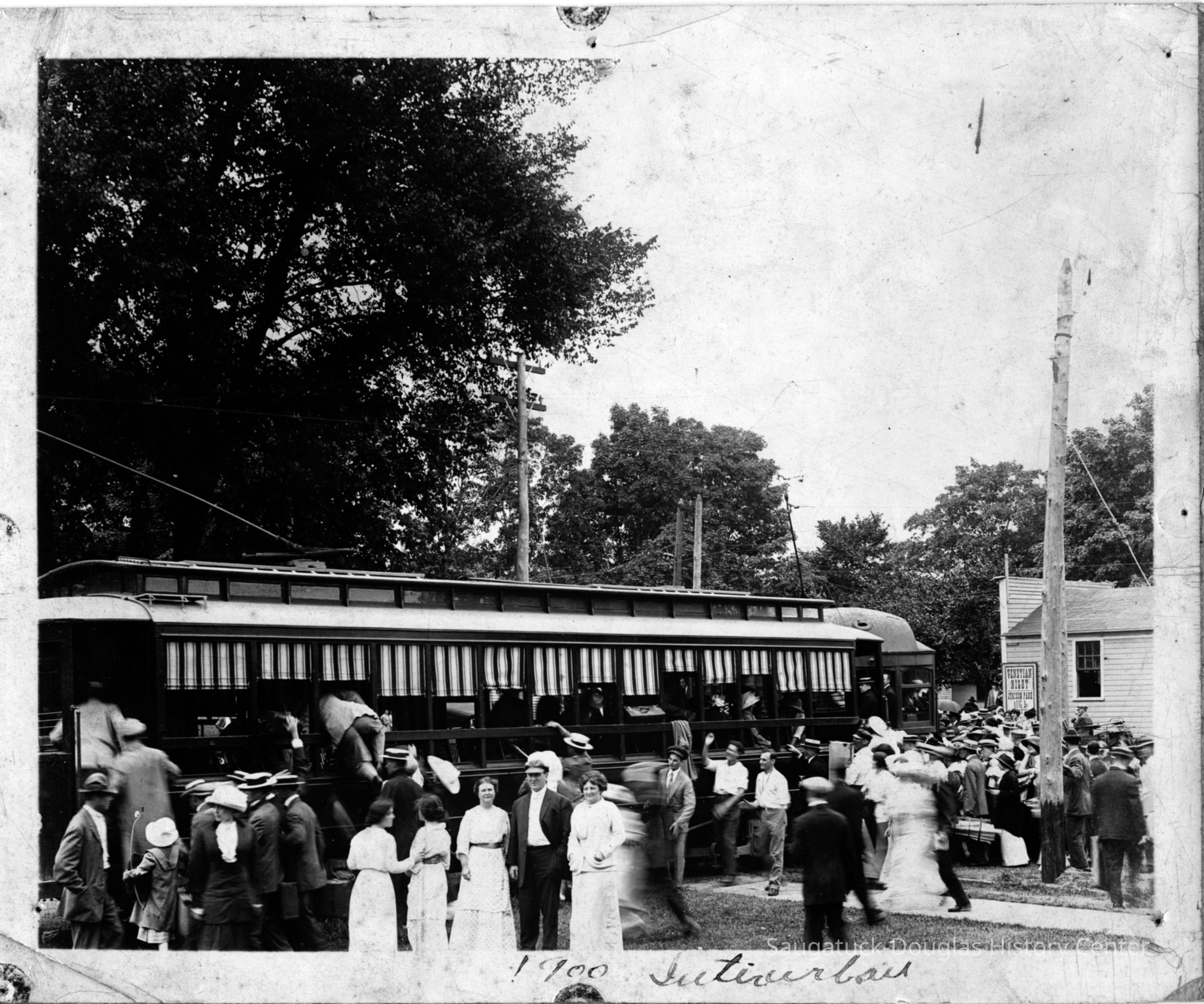 There people look at the camera while more people board an Interurban electric train or trolley. Location may be the turn-around loop near the Hotel Butler.Photograph Details
