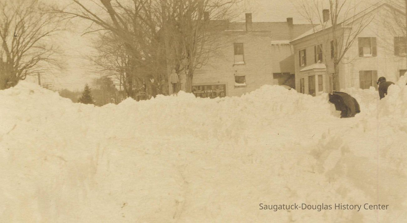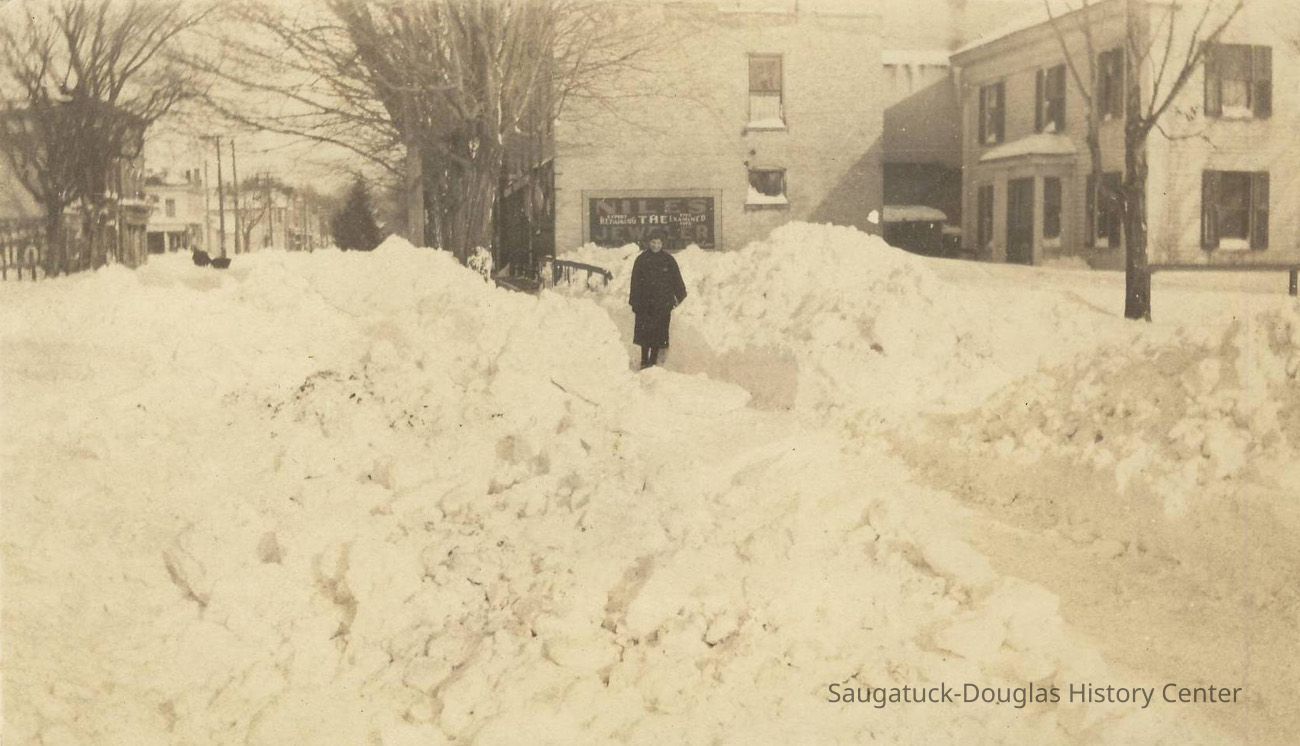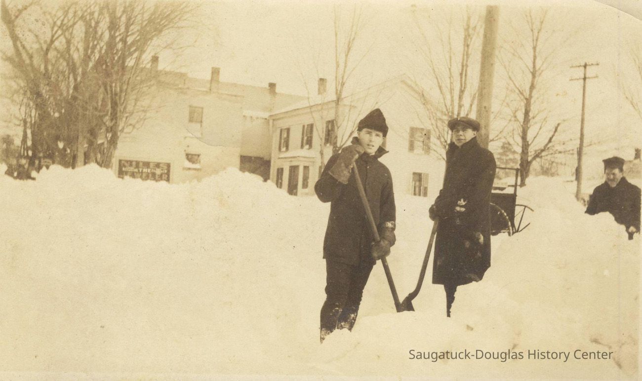 2 - Three people talking, one leaning on a snow shovel, in the Interurban track turnaround loop. Saugatuck Village Hall visible on the left. Note on back "Where Interurban used to come on corner by Village Hall etc."