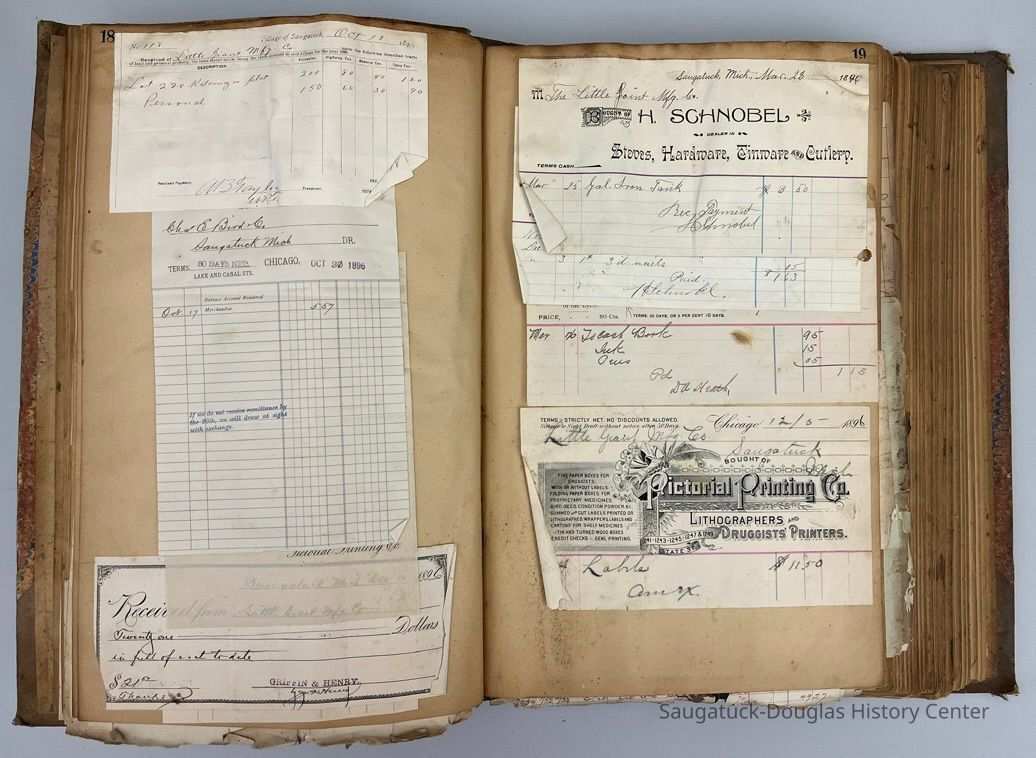 Ledger with invoices pasted to the pages. Many invoices are to or from the The Little Giant Manufacturing Co.