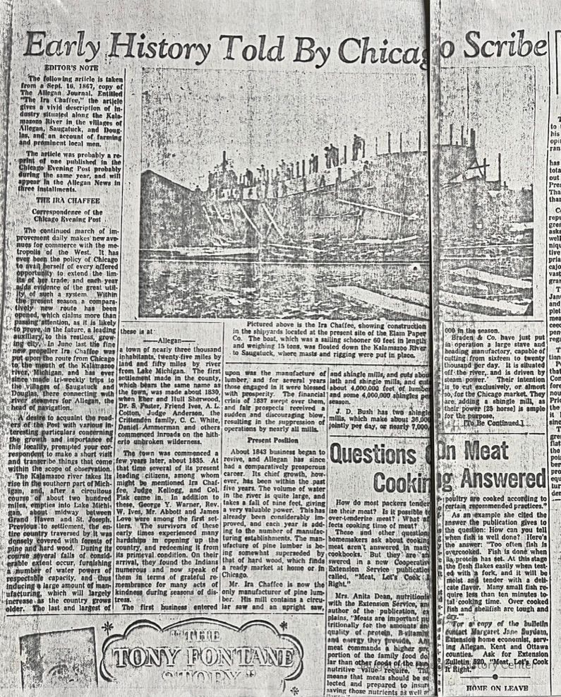 The "article gives a vivid description of the industry situated along the Kalamazoo Rover in the villages of Allegan, Saugatuck, and Douglas, and an account of farming and prominent local men."