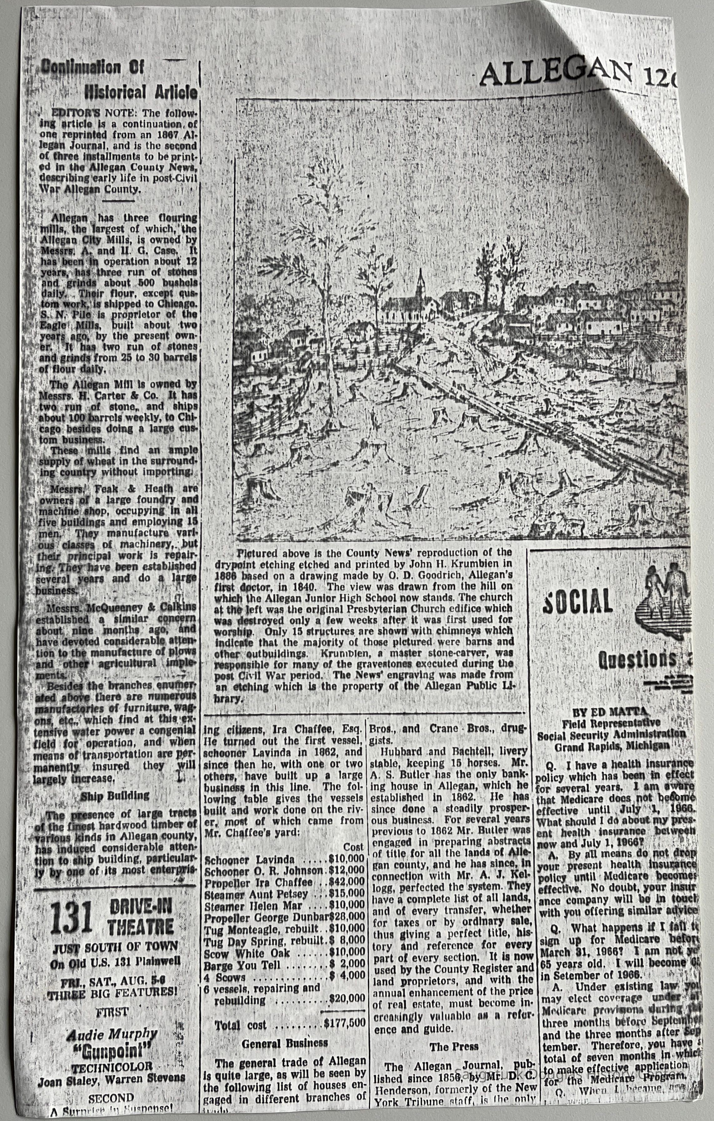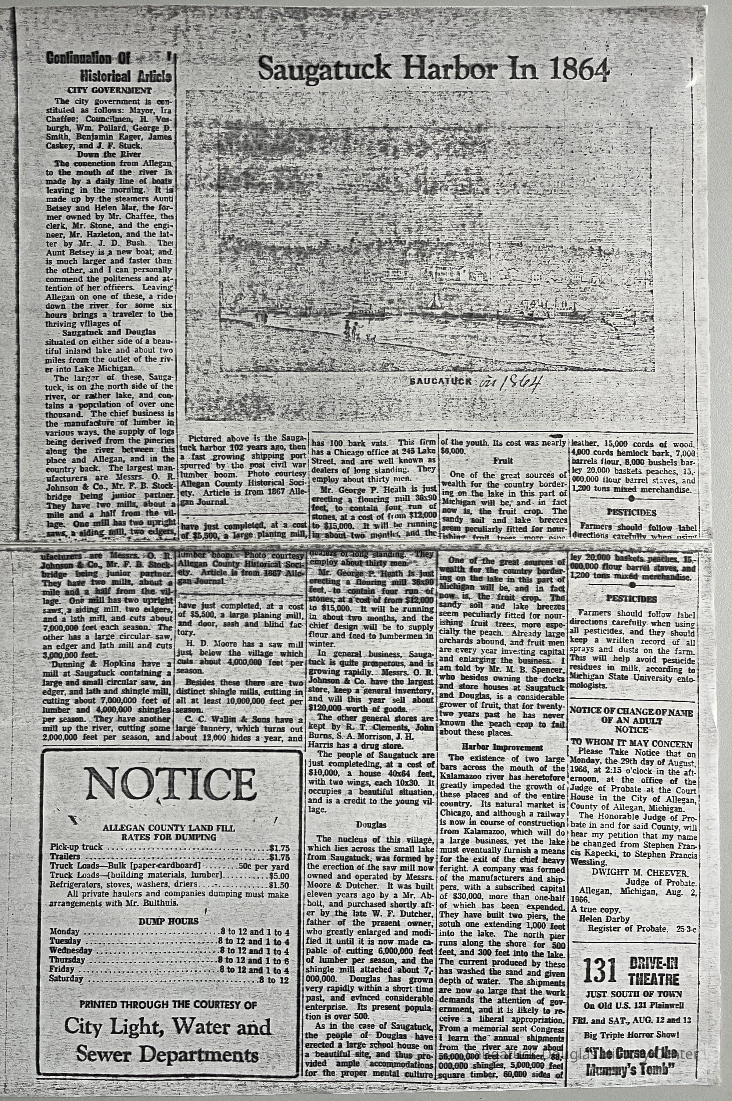 Six photocopies of a reprint of an article from the Sept. 16, 1867 Allegan Journal. The reprint was presented over three issues of Allegan County News and Gazette, likely including the Thursday, July 28, 1966 issue. The 1867 article "was probably a reprint of one published in the Chicago Evening Post, probably the same year."Context