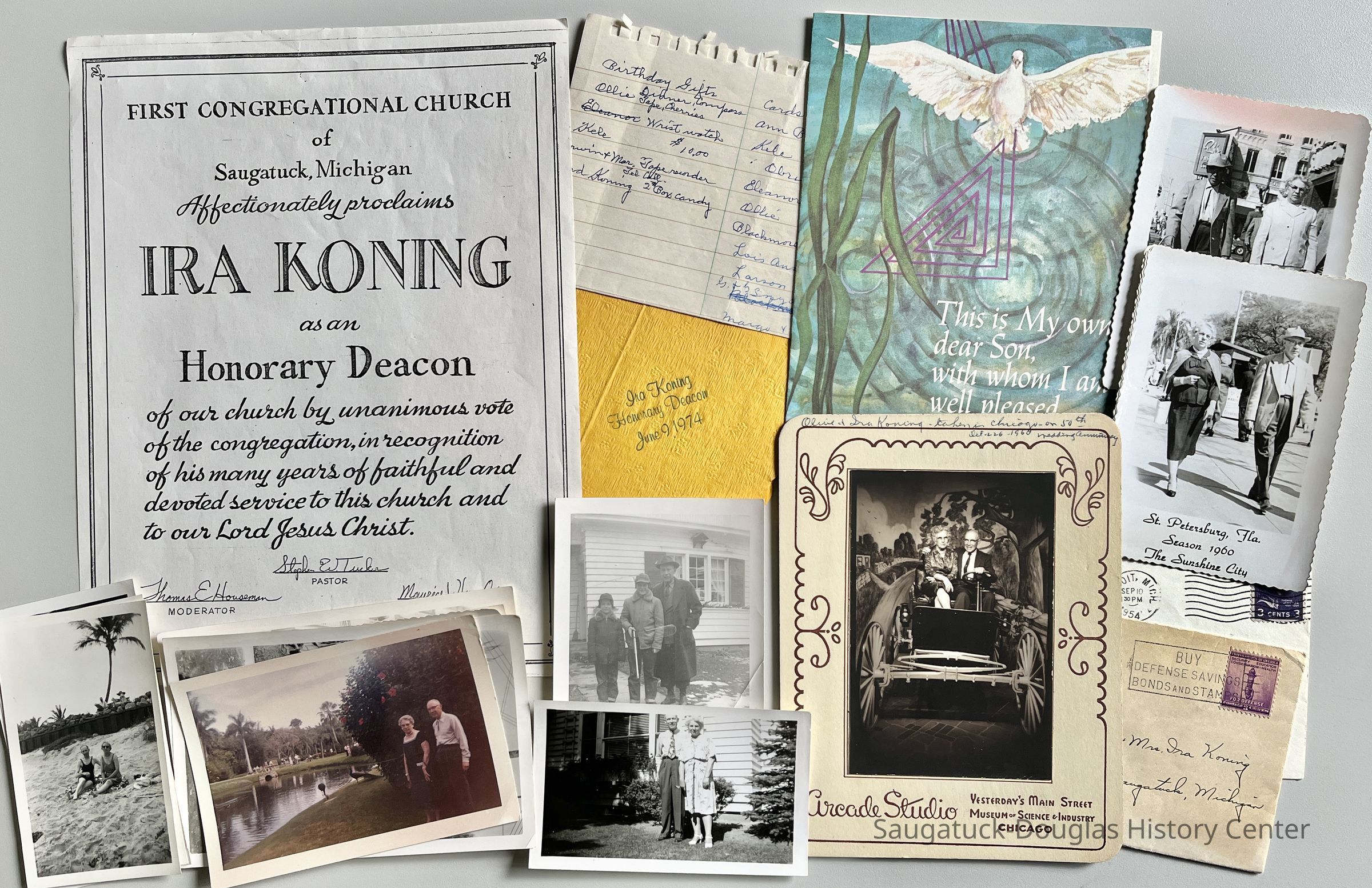 Photos, honors, letters and documents created by or pertaining to Ira Koning. Many photos from travels and vacations to Florida and a certificate naming Ira an Honorary Deacon of the First Congregational Church.
