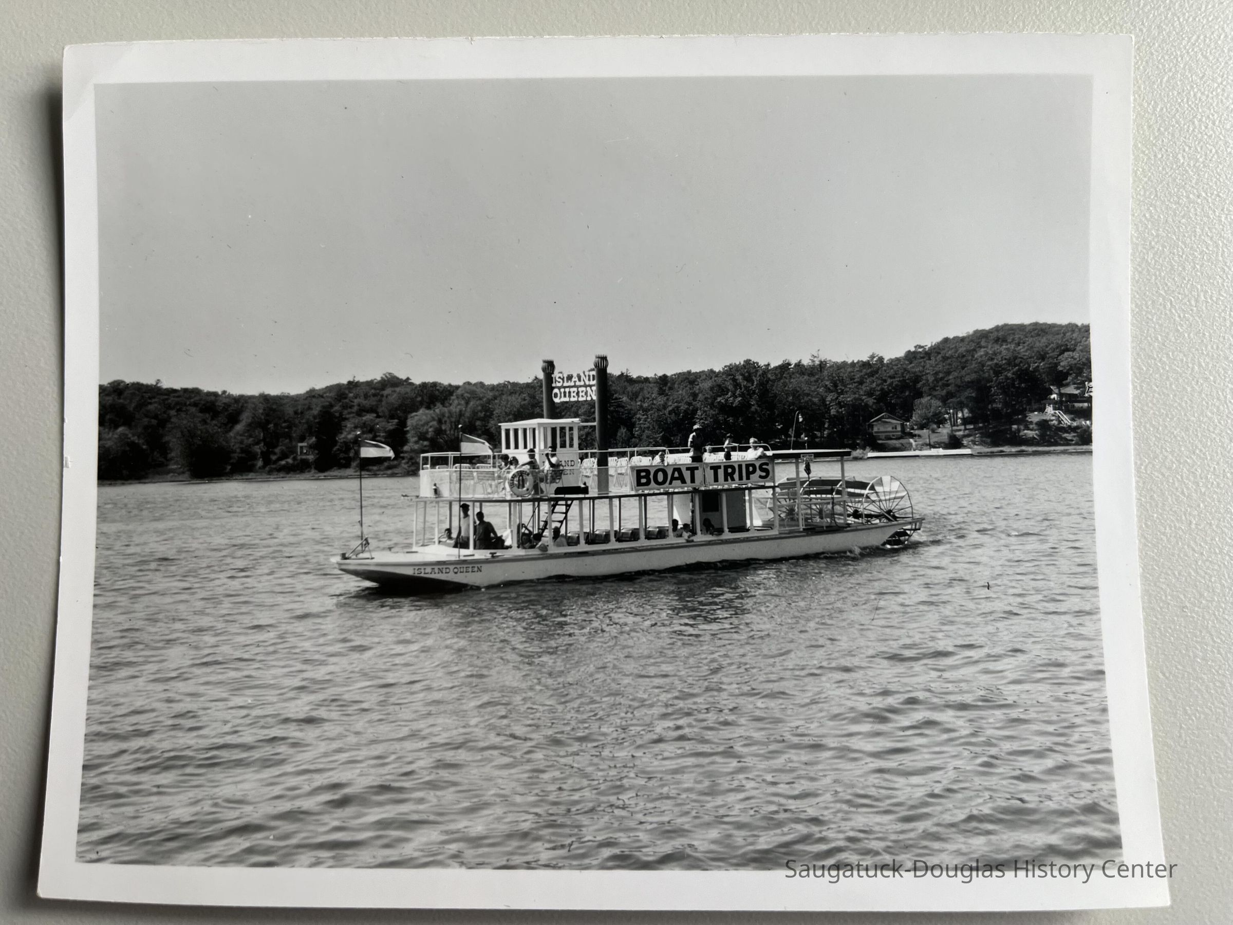The Island Queen sternwheeler or paddlewheeler with a handful of passengers on her upper and lower decks.Photograph Details
