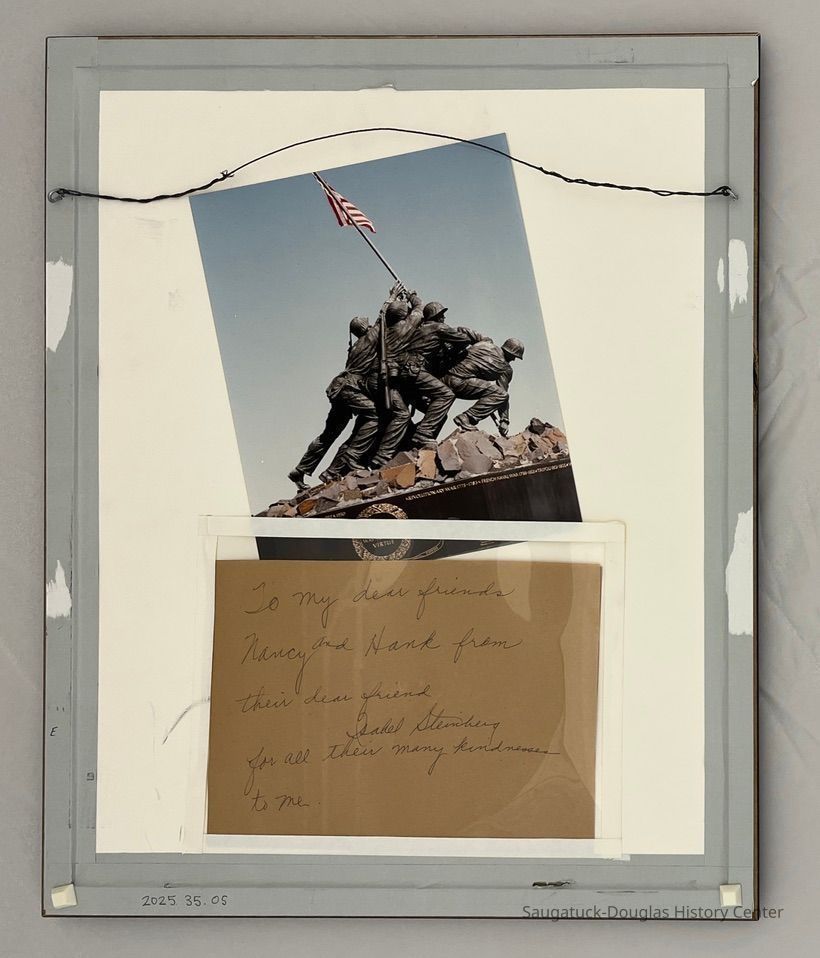 Attached to the back of the frame is a pocket containing a dedication, "To my dear friends Nancy and Henry from their dear friend Isabel Steinberg for all their many kindnesses to me" that was likely attached to the work's original backing paper and a color photo of the Marines Arlington monument that was based on the Rosenthal image.Context