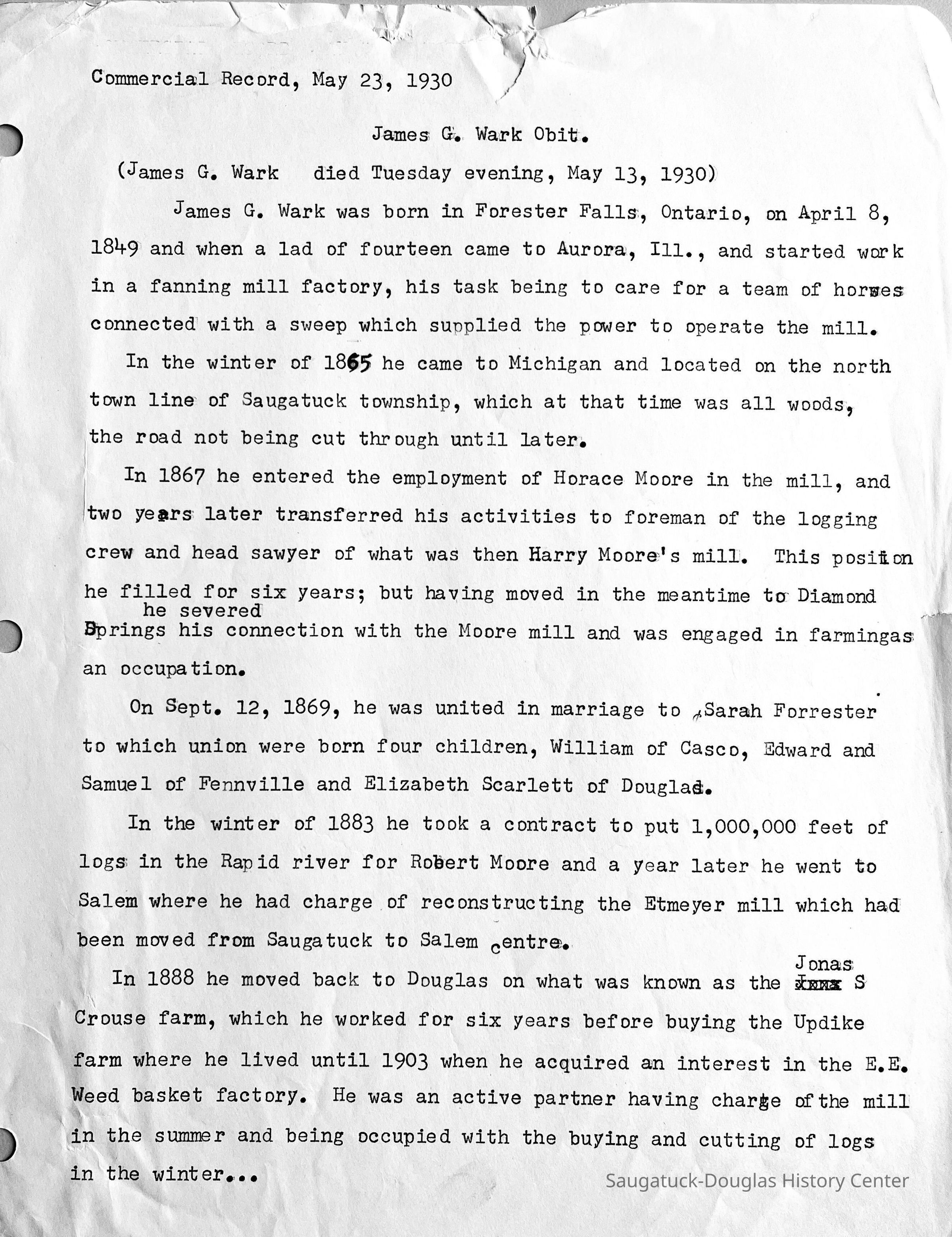 Notes: James G. Wark was part owner of the Douglas Basket Factory and the Fennville Fruit Exchange