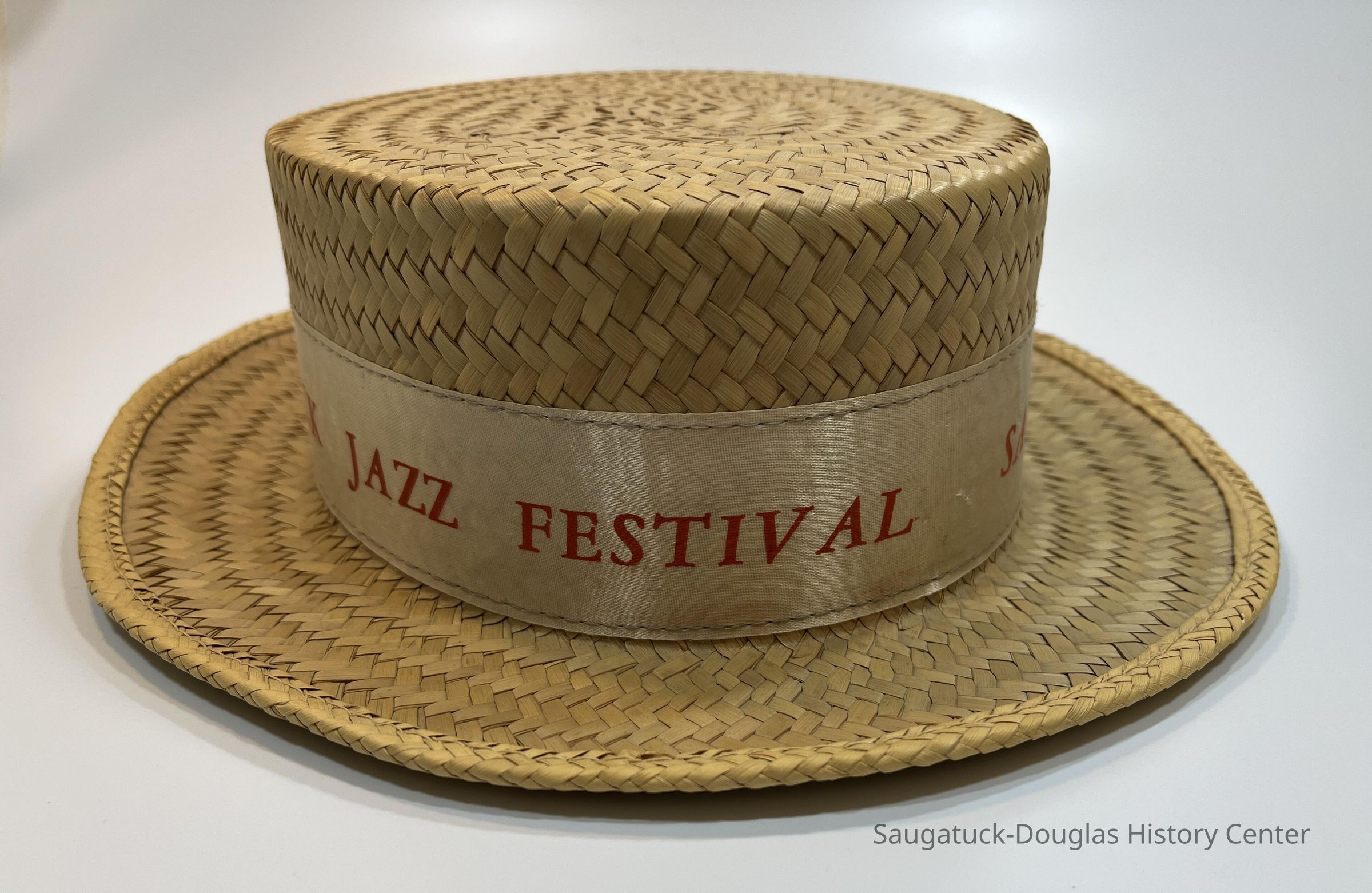 Natural colored men's straw "boater" hat with the words, "Saugatuck Jazz Festival" written in red letters on a white satin ribbon around the crown of the hat.Collection