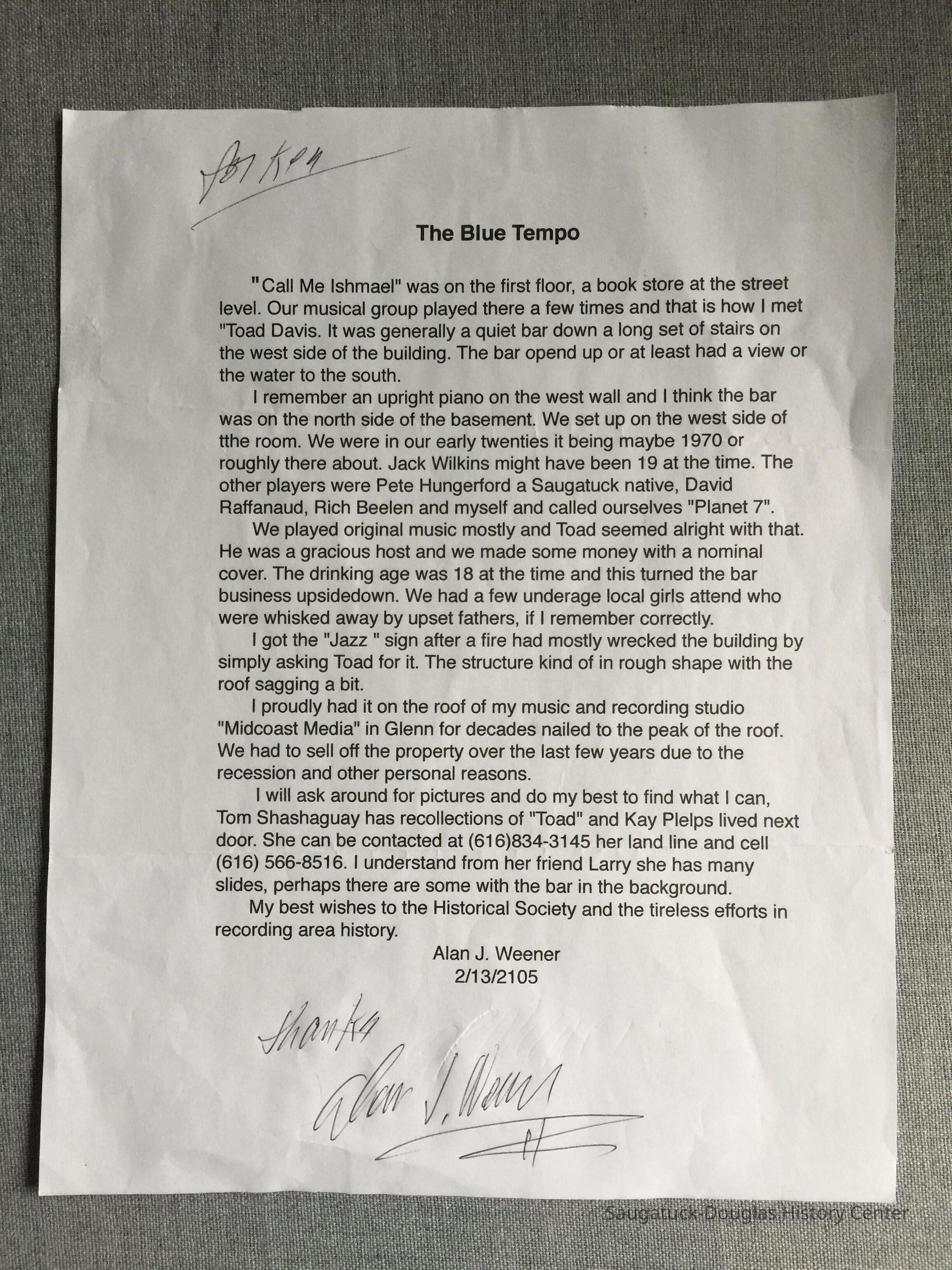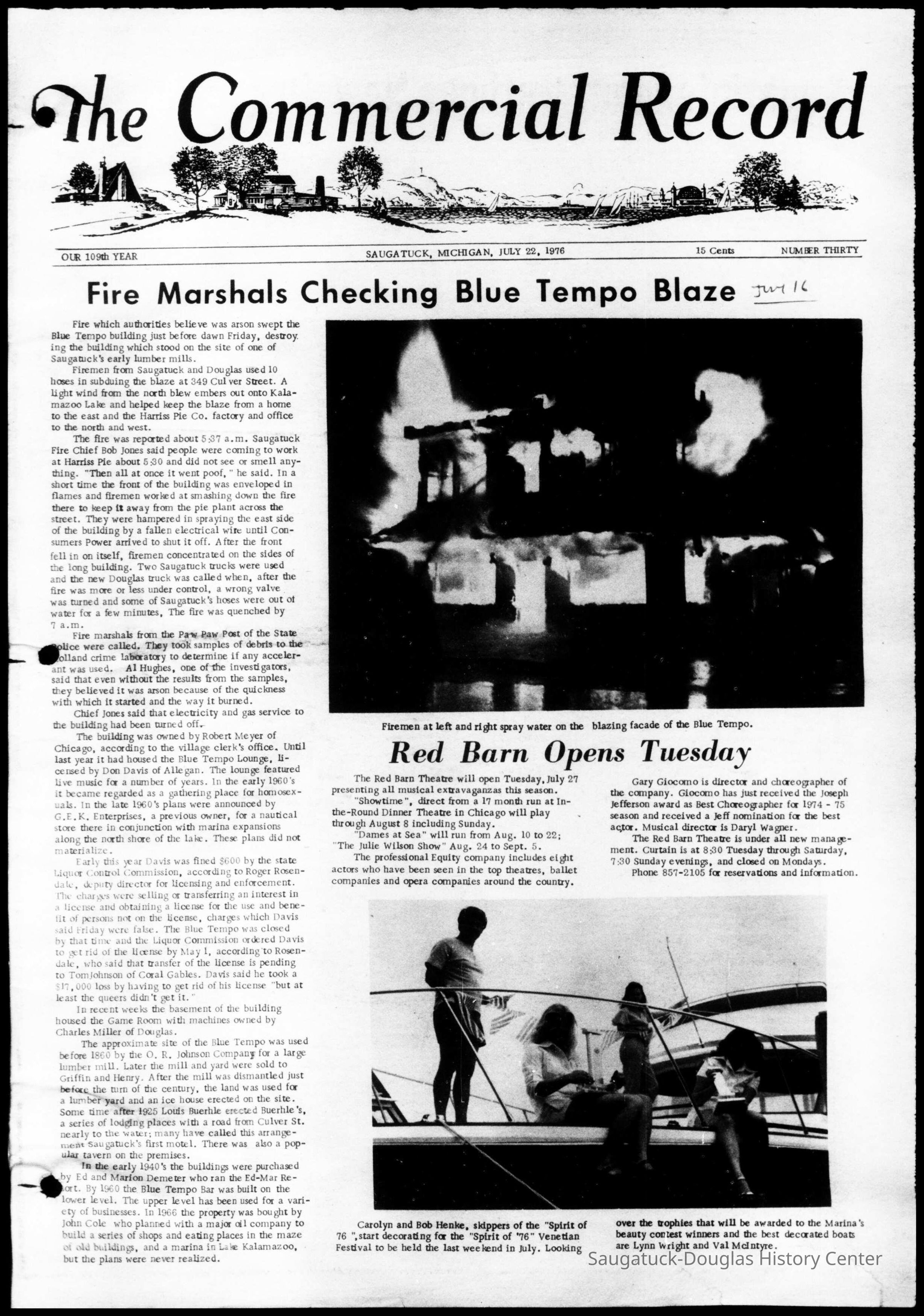 Founded by local entrepreneur Don "Toad" Davis, Saugatuck’s Blue Tempo House of Music and Bar was a well-known, year-round hub of the live-jazz scene that later evolved as an early Michigan mixed gay-straight dance club. The building was destroyed by mysterious fire in 1976 but the sign survived. Al Weener took the sign from the burned out building. He was given permission by Don Davis although Mr. Davis did not own the structure at the time.Cataloged By
