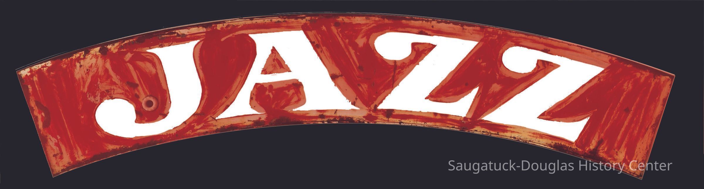 Curved metal sign that likely once had neon letters spelling out "JAZZ"Context