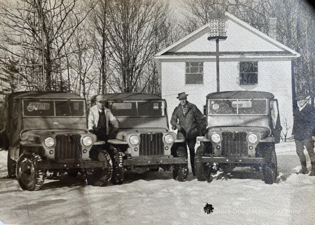 Three jeeps and three men with snow on the ground. A metal tower, a multi-unit swallow bird house on a pole and a white, clapboard structure in the background. Likely taken after 1954 when Bennett purchased Cook mansion.